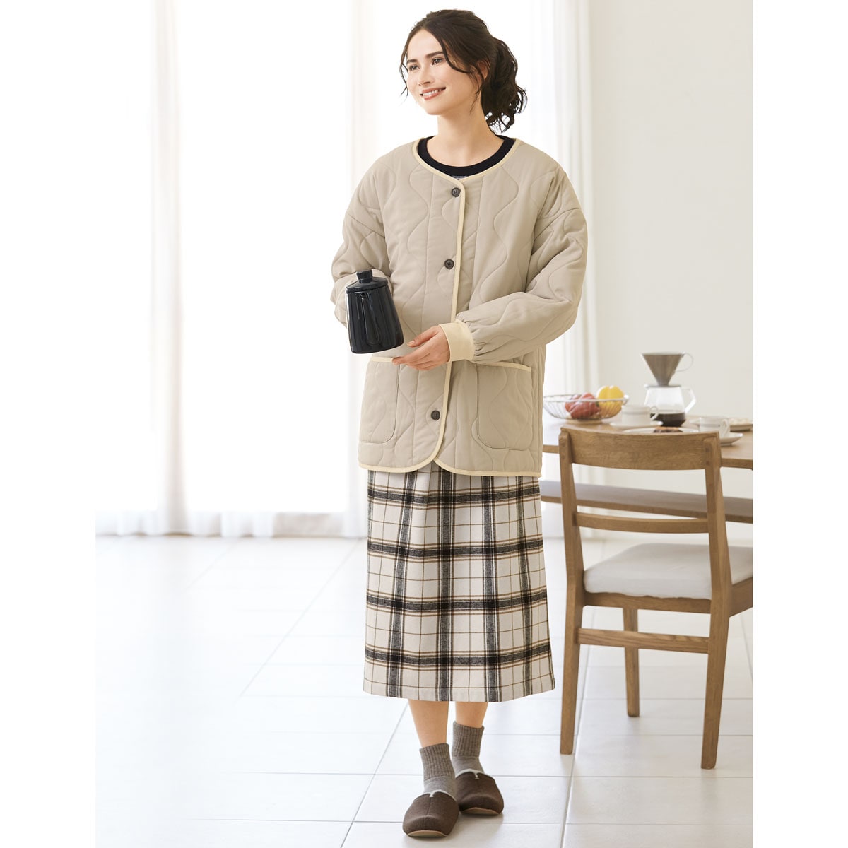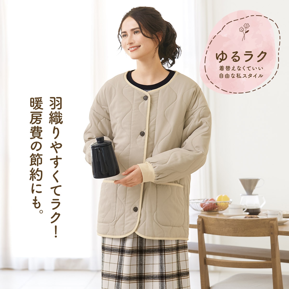 軽くてあったか、中わたキルトのオシャレなおうちはんてん。袖口リブで袖をたくし上げられるから、家事の時にも使えます♪