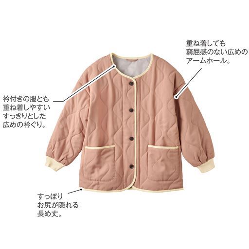 薄い中わたをはさみ込んだ、空気を含んでふんわり暖かいキルト素材の羽織り。重ね着できるビッグシルエットなのに、軽やかで暖か。表地は表面感のある生地で、裏側は重ね着しても動きやすいすべりの良いつるんとした生地。袖をたくし上げやすいリブ袖口、衿付きトップスとも重ね着しやすいすっきり広めの衿ぐり、窮屈感の無い広めの袖ぐりなど、こだわりも満載。前左右に付けたスマホが入る大きめポケットも便利です。このアイテムがあれば、おうち時間を暖かで快適に過ごせます。