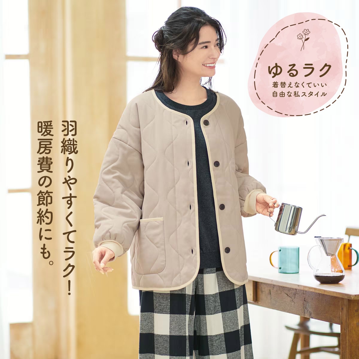 軽くてあったか、中わたキルトのオシャレなおうちはんてん。袖口リブで袖をたくし上げられるから、家事の時にも使えます♪