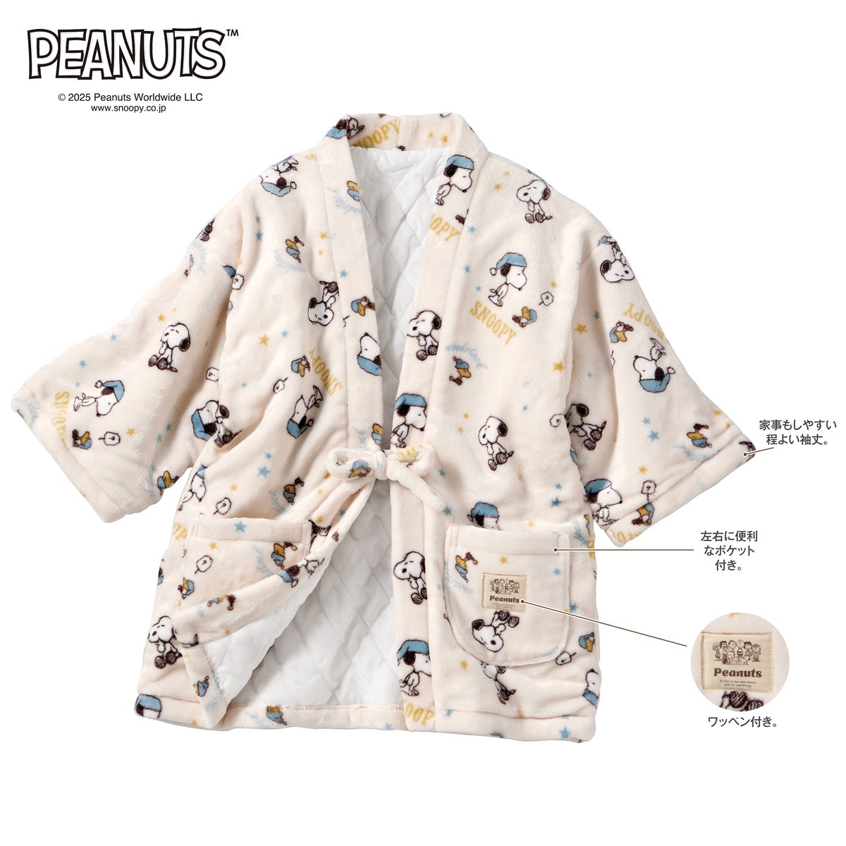 - デザイン -SNOOPYの総柄とやさしい色にほっこり癒される♪家事もしやすいほどよい袖丈。左右に便利なポケット付き。かわいいワッペン付き。- 素材 -表はあったかリッチな光沢感のある起毛素材。裏側はあたたかな中綿キルトで防寒・節電対策にぴったり。