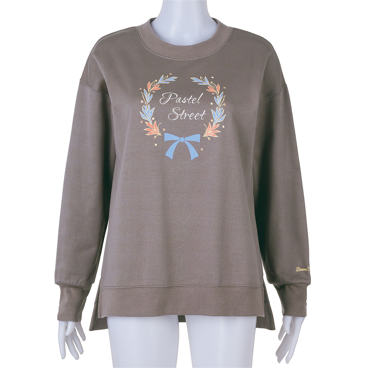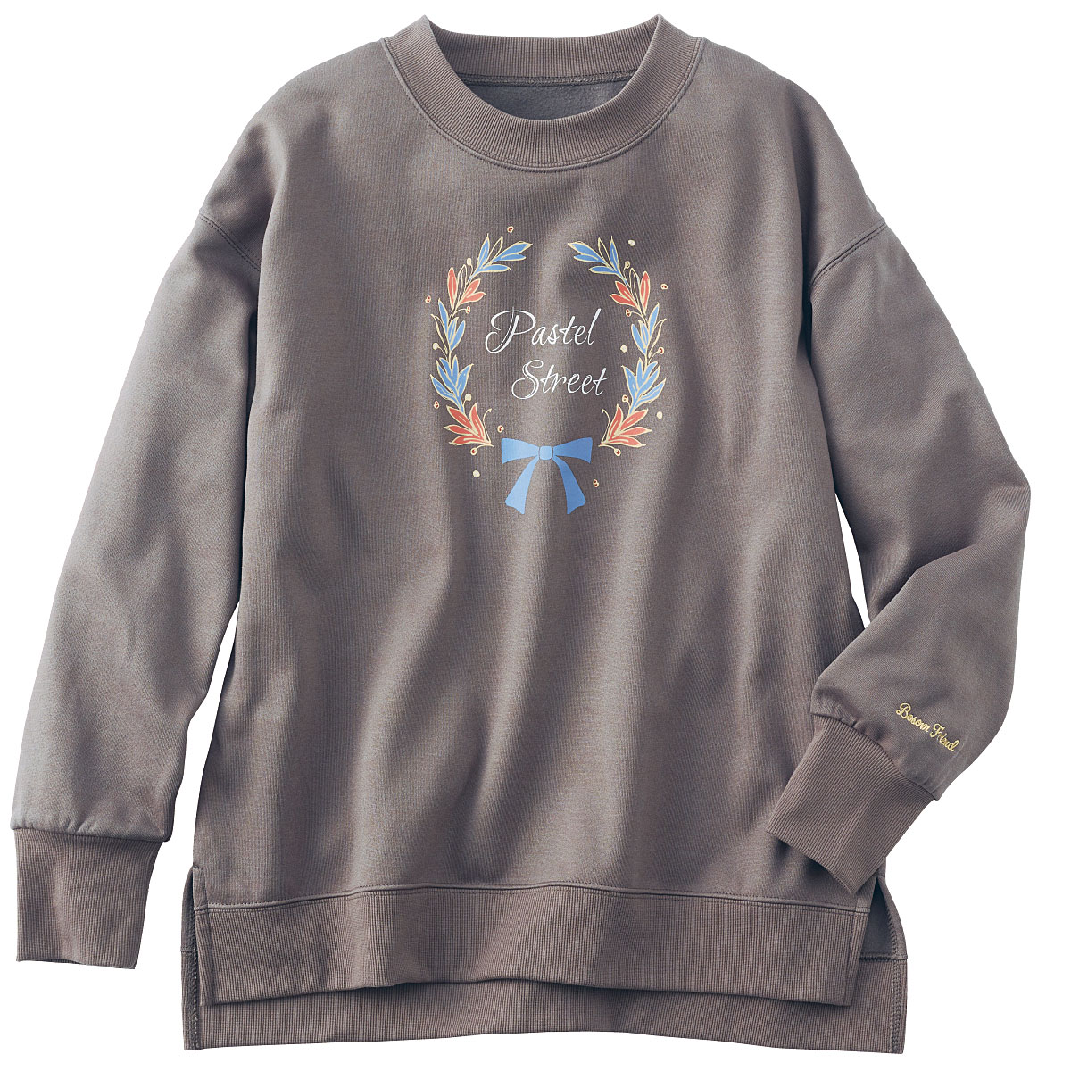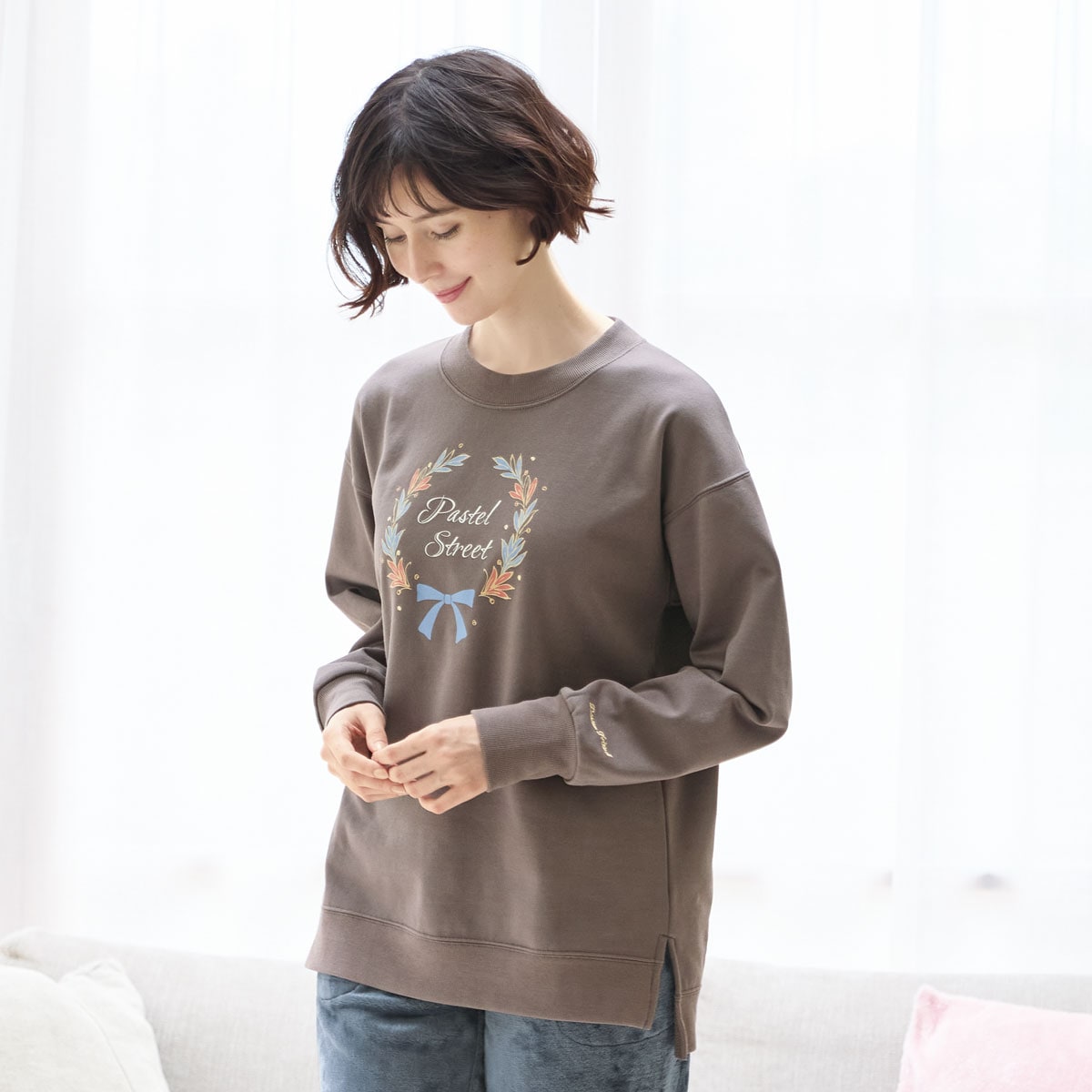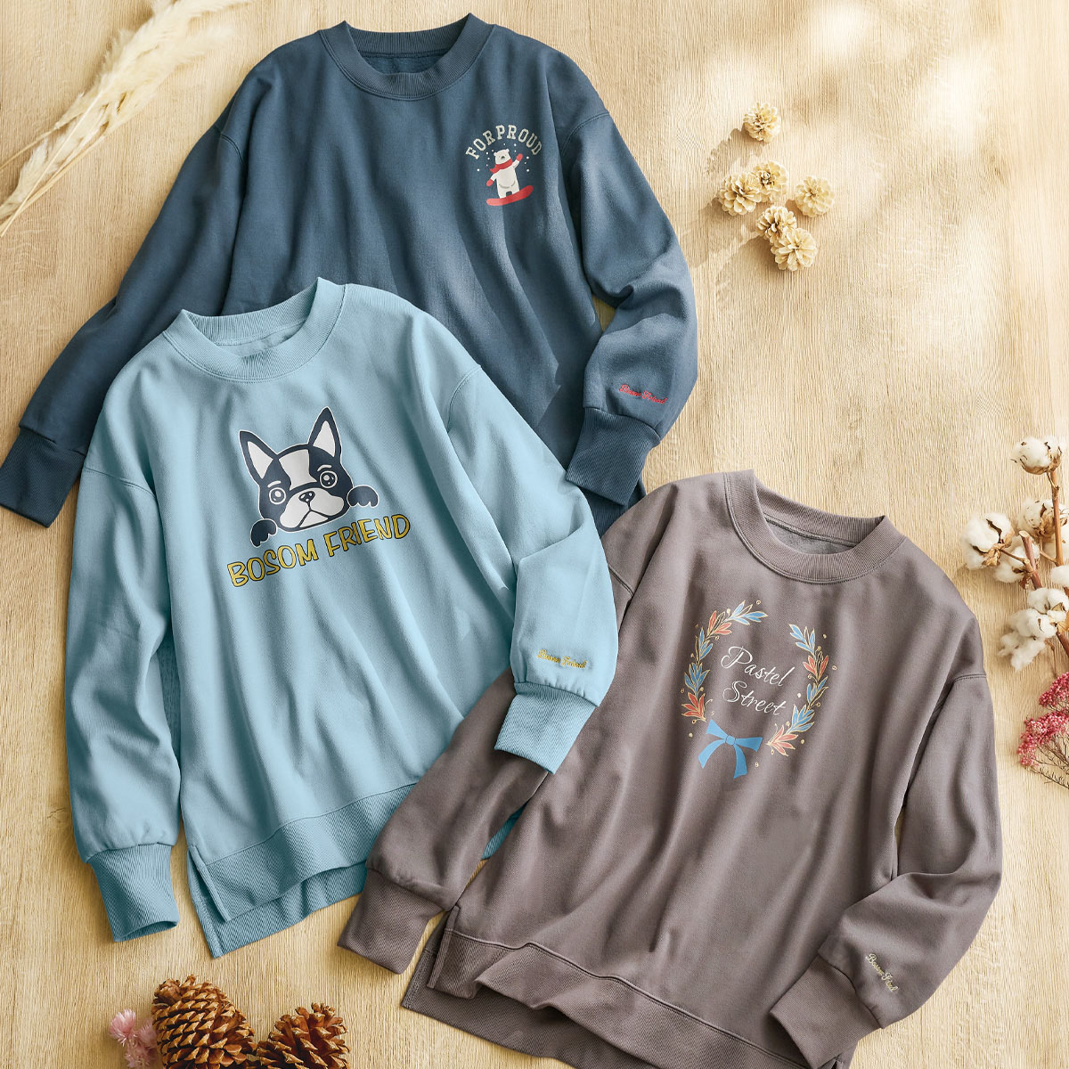 裏側をふわっと起毛させたプルオーバー。1枚であたたかく、厚みがあるのに軽いからラクちんな着心地で、乾きやすいのもポイント。のんびりとリラックスして過ごす日にぴったりな1枚です。前身頃のプリント柄がきゅんとかわいく、左袖口の配色刺繍がアクセントに。両脇スリット入りでこなれた印象も◎大きいサイズも展開(M~5L)