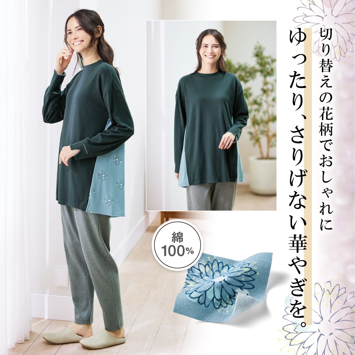 【いいな、いいね】 母にいいなと思えるものは、私もいいねと快適に過ごせる着心地。大切な方へ伝えたい、感謝の想いを花々に込めました。