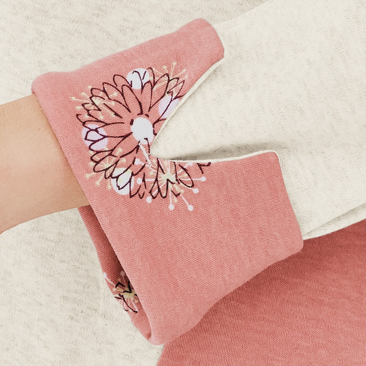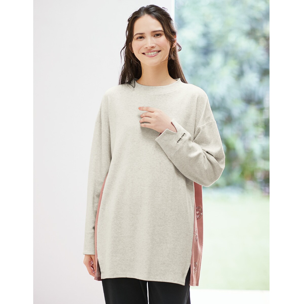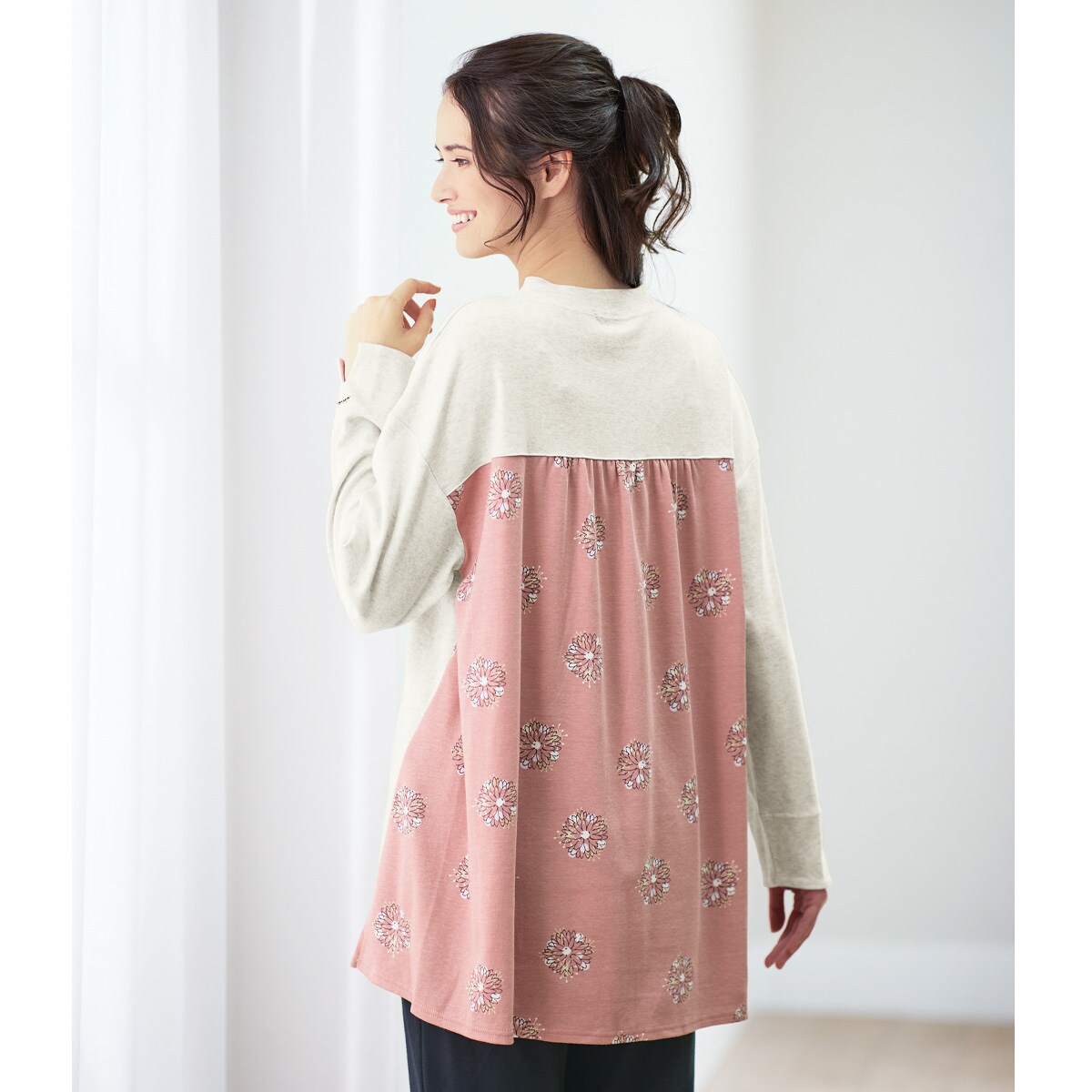 適度な厚みのある綿100%スムース素材のゆったりプルオーバー。ガーベラをあしらった華やかなプリント生地を後ろ身頃・袖口に切り替え使いしました。袖口はスリット入りで腕まくりしやすく、折り返せばプリント柄がチラリ可愛い。袖口刺繍が上品なアクセントを添えます。少し立ち上がったネックラインで、気になる首元をさりげなくカバー。後ろ長め丈でヒップも隠れます。裾には動きやすいスリット入りで、毎日快適。プリント同柄のパジャマもあります(NW-1246)。ふっくらさん対応サイズplump(プランプ)もあります。