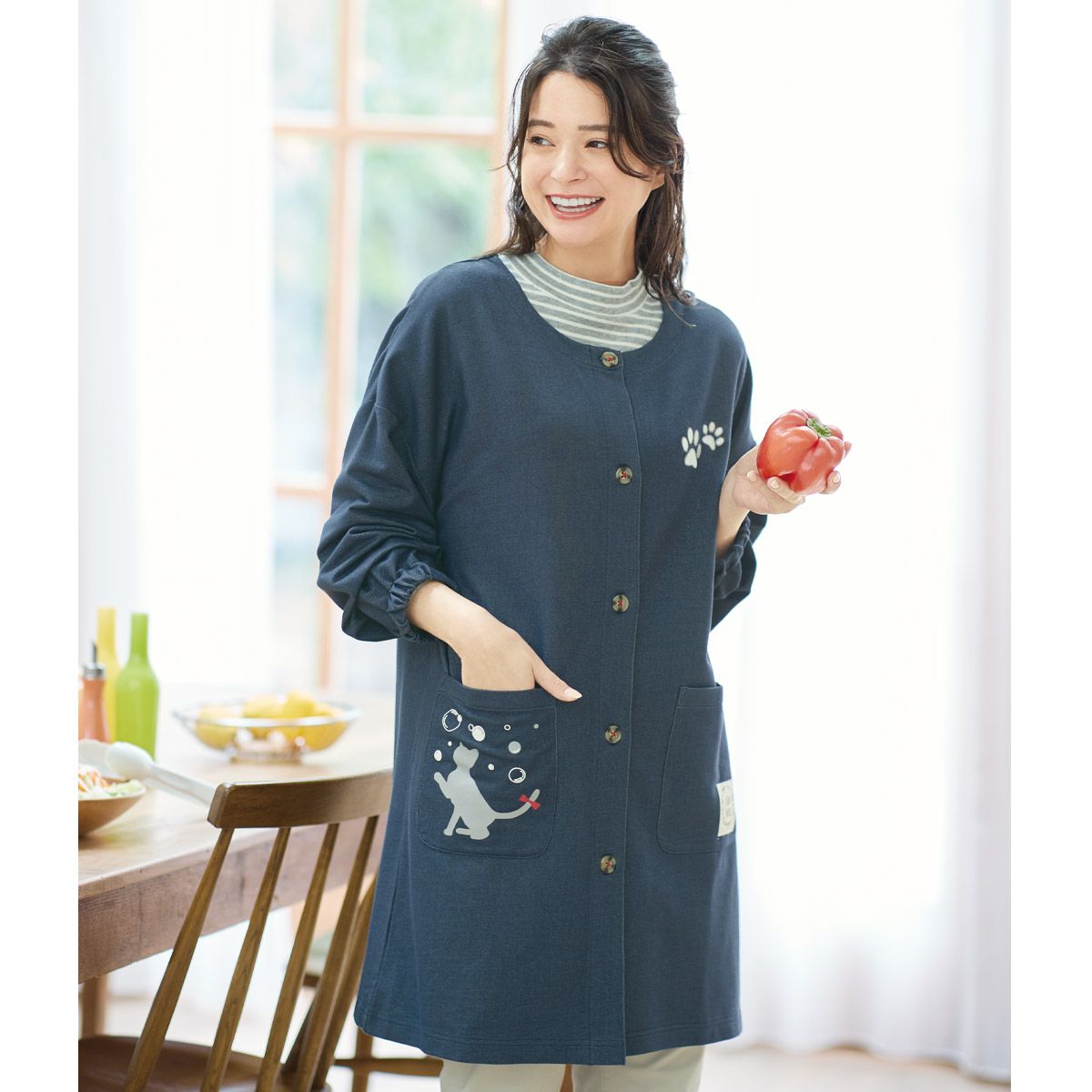 デニム調ニット素材は、やわらかく伸縮性◎だから家事にぴったり。使い分けできる4つのポケット付きで、ポケット内もすっきり整理。「ちょっとそこまで」もOKなデザインで家事時間もかわいく快適に♪大きいサイズも展開(M~5L)