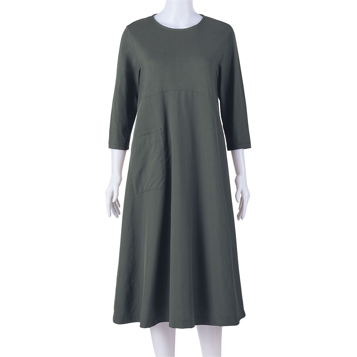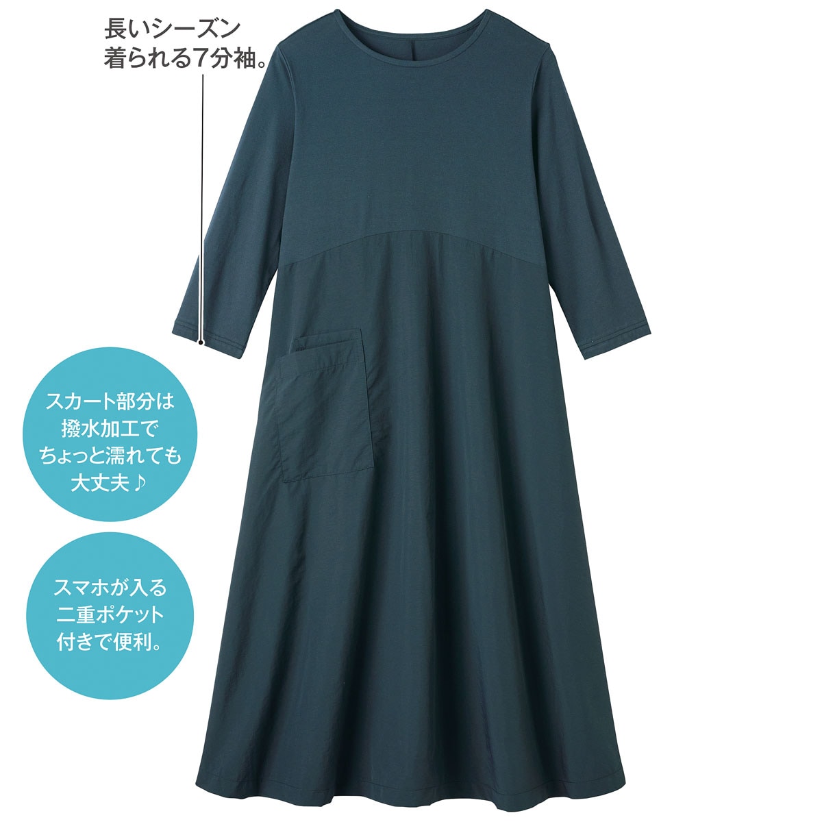 綿100%天竺素材とナイロンタフタ素材を組み合わせた技ありルームワンピース。スカート部分は撥水加工でちょっと濡れてもOKだから水仕事にぴったり♪動きやすく体型カバーが叶うふんわりシルエット&7分丈で長いシーズン活躍。スマホが入る二重ポケットが便利。ルームウェアにもちょっとしたお出かけにも使えます。大きいサイズまで展開(M~5L)。
