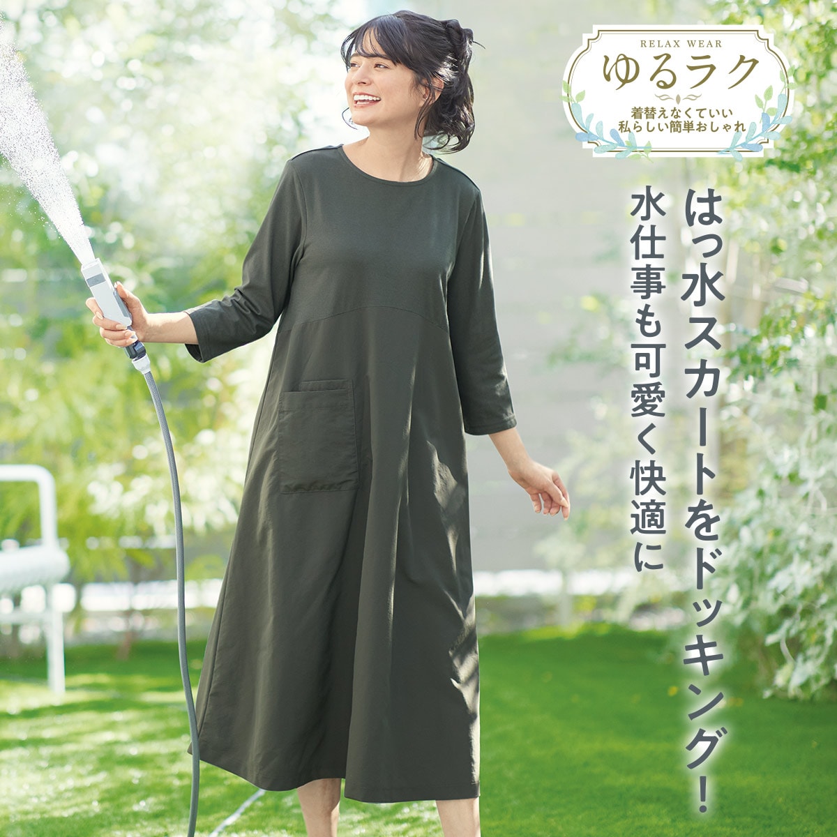 おうち時間にもワンマイルにも♪リラックス感のあるゆったりしたデザインのルームワンピース。スカート部分は撥水加工でちょっと濡れてもOKだから水仕事にぴったり♪
