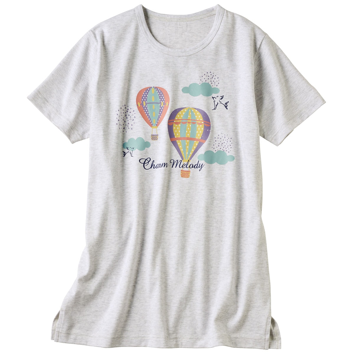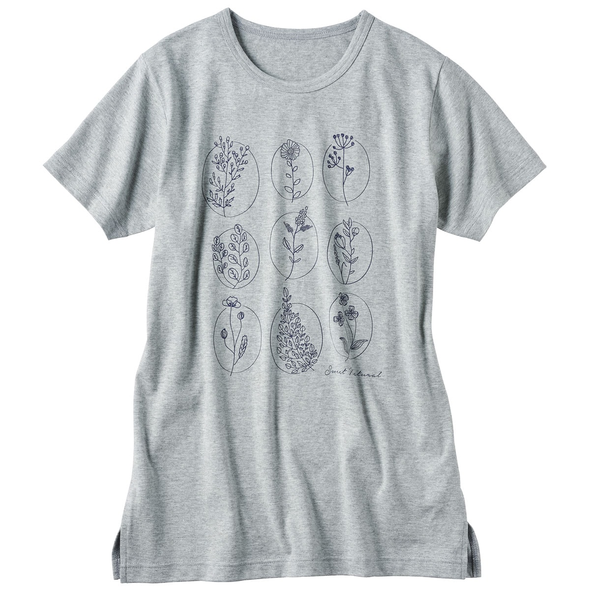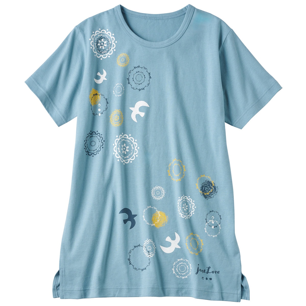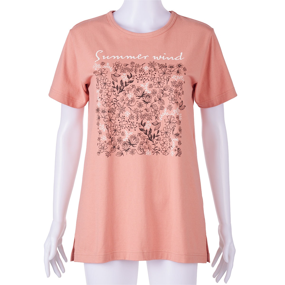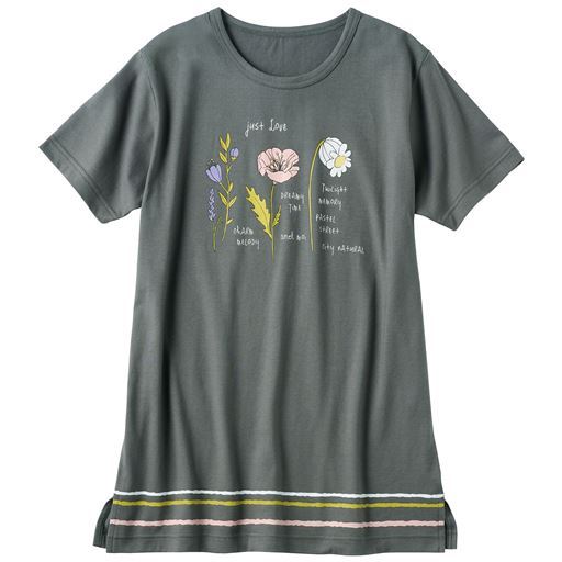 ■〔ニット〕綿100%(天竺)●両脇スリット(M・L…約7cm LL・3L・5L…約12cm)●プリントは前身頃のみに入っています●アンティックブルー、ライトグレーはかすれ調プリントです●中国製【綿100%】 【大きいサイズも展開】(M~5L)【生地厚指数2】