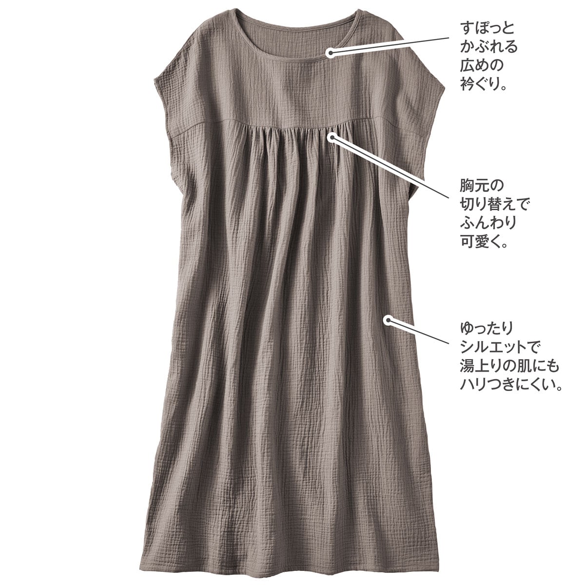 肌にハリつきにくい、楊柳ダブルガーゼ素材。縦横にシボ感があり、ふっくらやわらかく優しい肌ざわりが特長。広めの衿ぐりでスキンケアしやすい♪こんなシーンにぴったり!●汗が落ち着くまでのクールダウンに●スキンケアやヘアケアを急ぎたいときに●ジムや入浴施設の着替えに