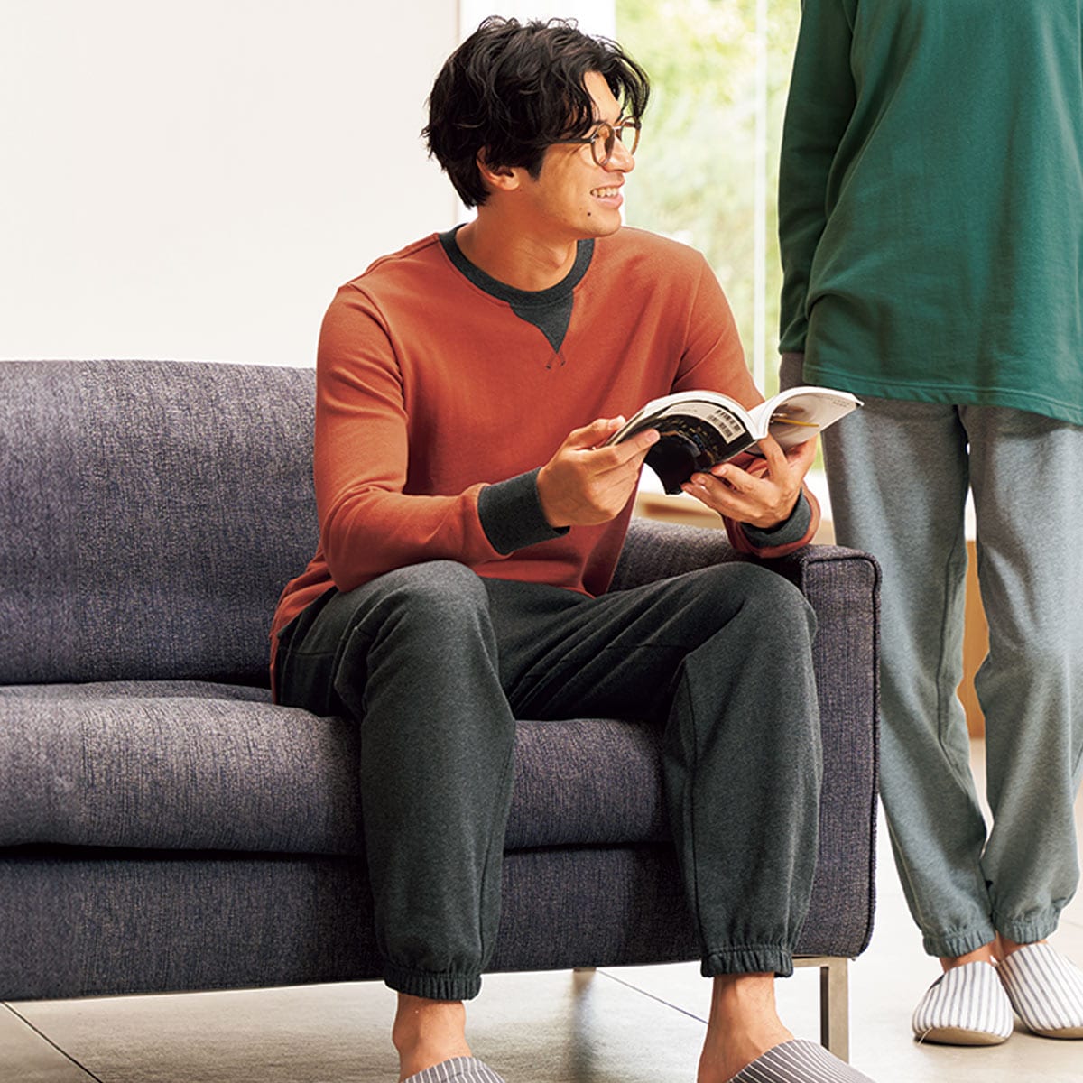 寒い季節もパジャマは綿100%にこだわりたい!というメンズにぴったりの綿100%裏毛素材のあったスウェットルームウェア。