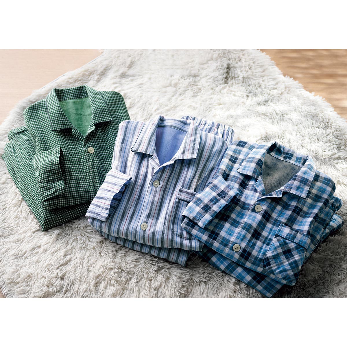 (左から時計まわりに)C(ストライプ)、B(ネイビー系チェック)、A(グリーン系チェック)