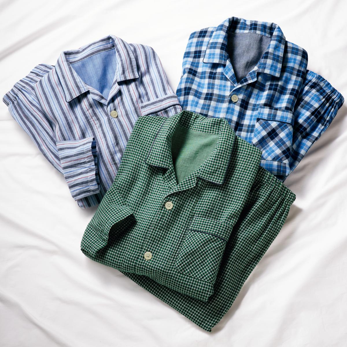 男女兼用パジャマって?メンズサイズで仕立てているので、だぼっと愛らしく着られて、ラク。ご家族お揃いで着用いただけます。女性は1つ小さめサイズを選んで。