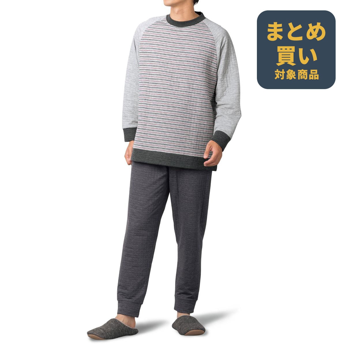 -素材-薄い中綿をはさみ込んだことで、空気を含んでふんわり温かなキルト素材のパジャマです。肌側は綿100%で柔らかな肌触り。-デザイン-ラグランスリーブで肩周りがらくちんです。ボーダー柄がカジュアル感をだしてくれて年齢問わず着れるパジャマです。