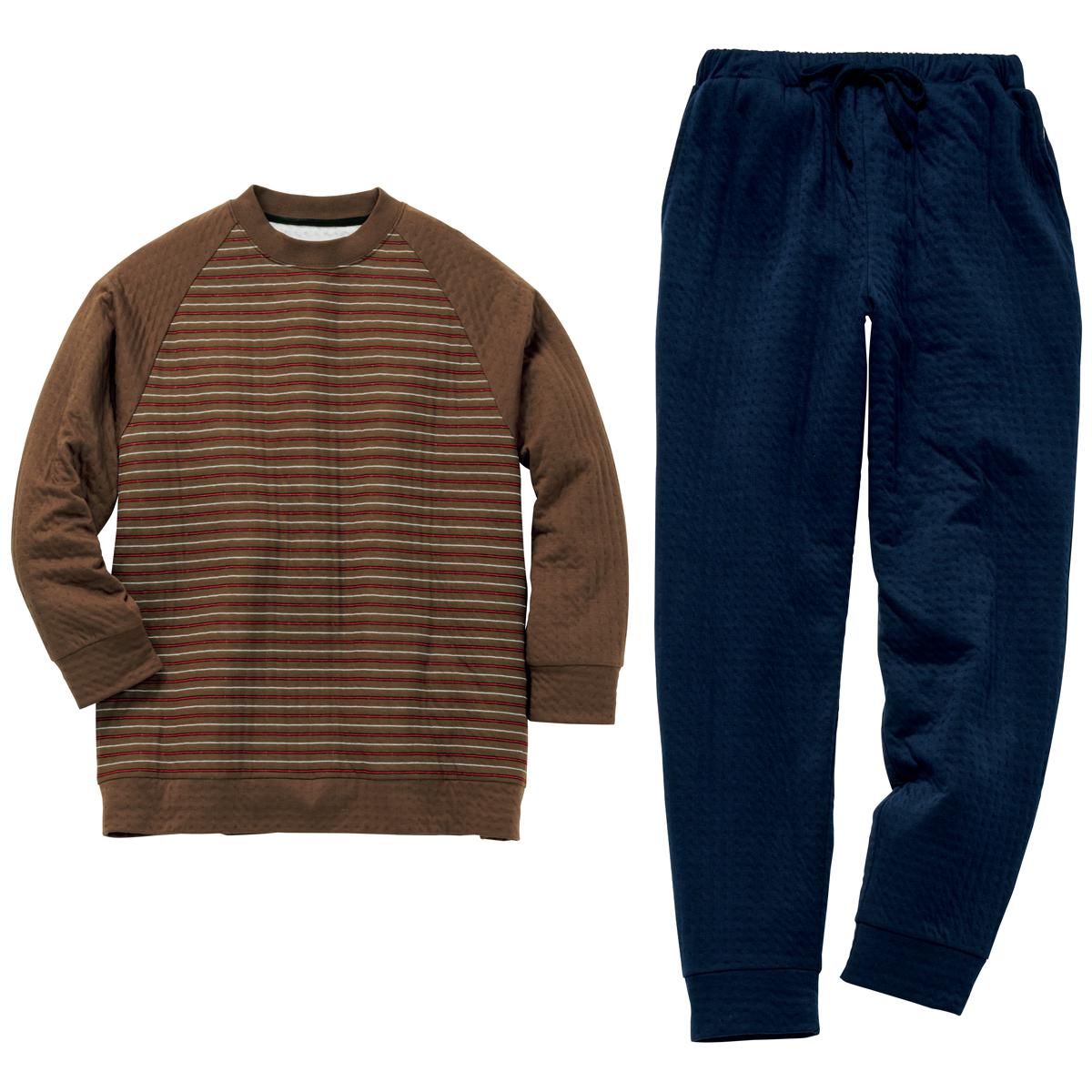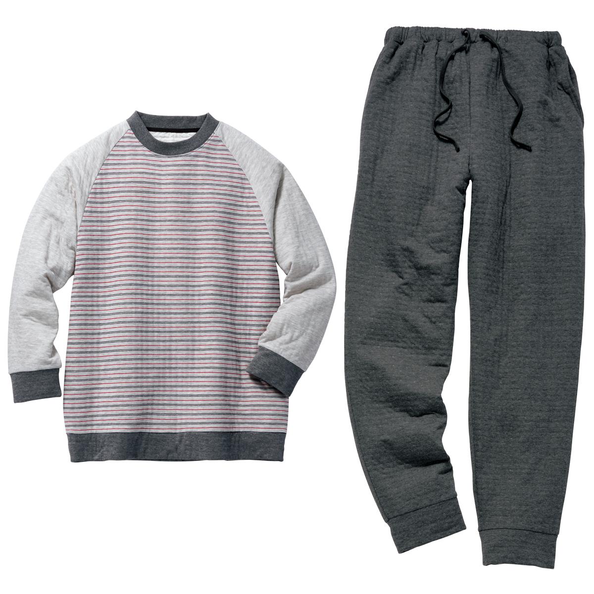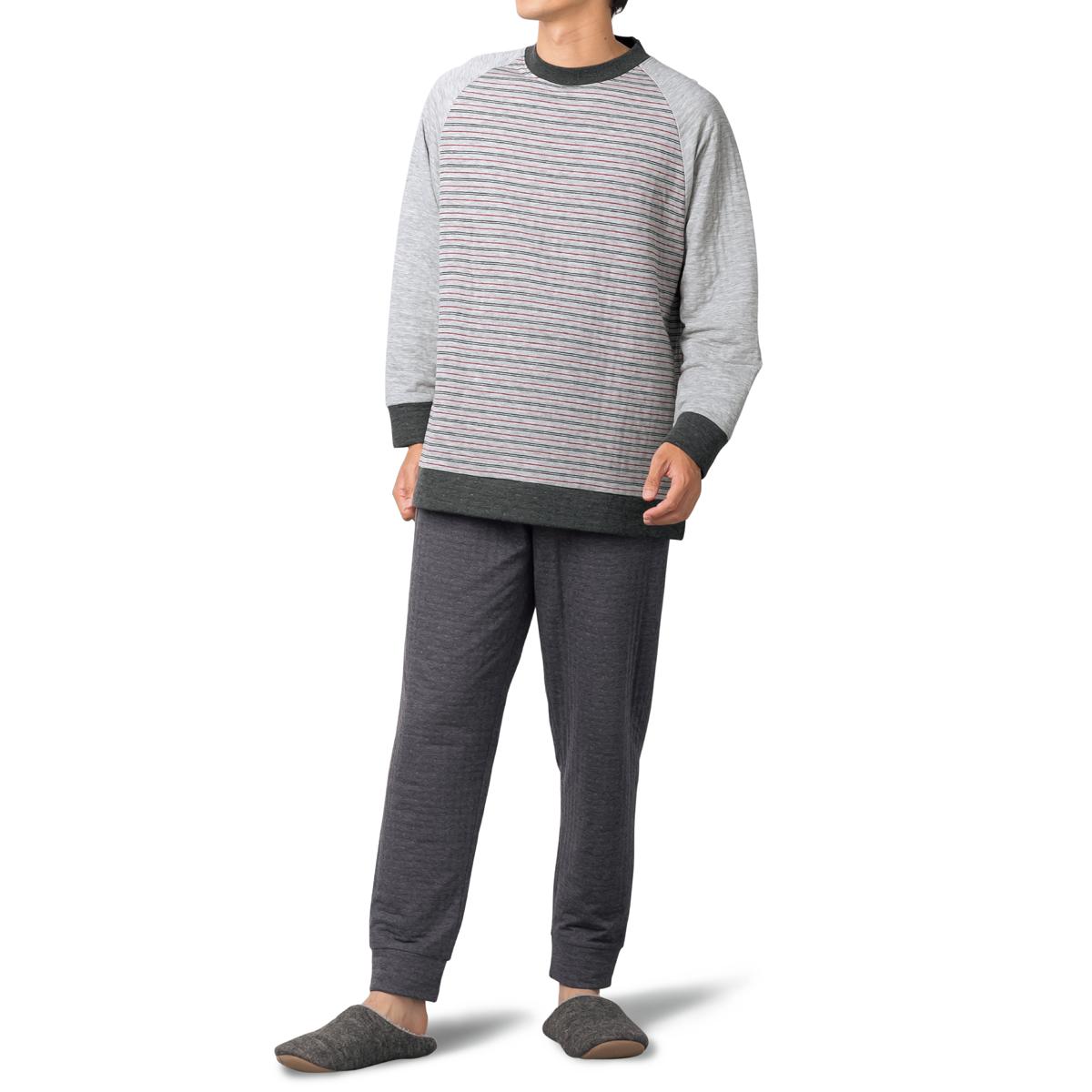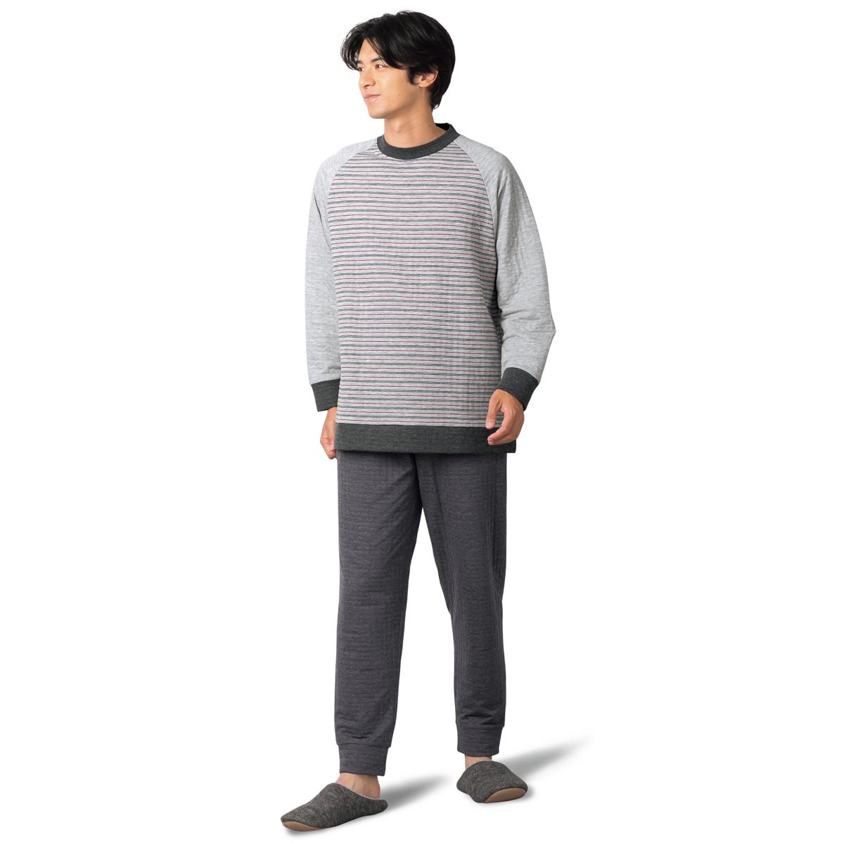 -お買い得ポイント-ボーダー柄がカジュアル感をだしてくれて年齢問わず着れるパジャマです。-デザイン-ラグランスリーブで肩周りが楽ちんです。-素材特徴-薄い中綿をはさみ込んだことで、空気を含んでふんわり温かなキルト素材のパジャマです。肌側は綿100%で柔らかな肌触り。