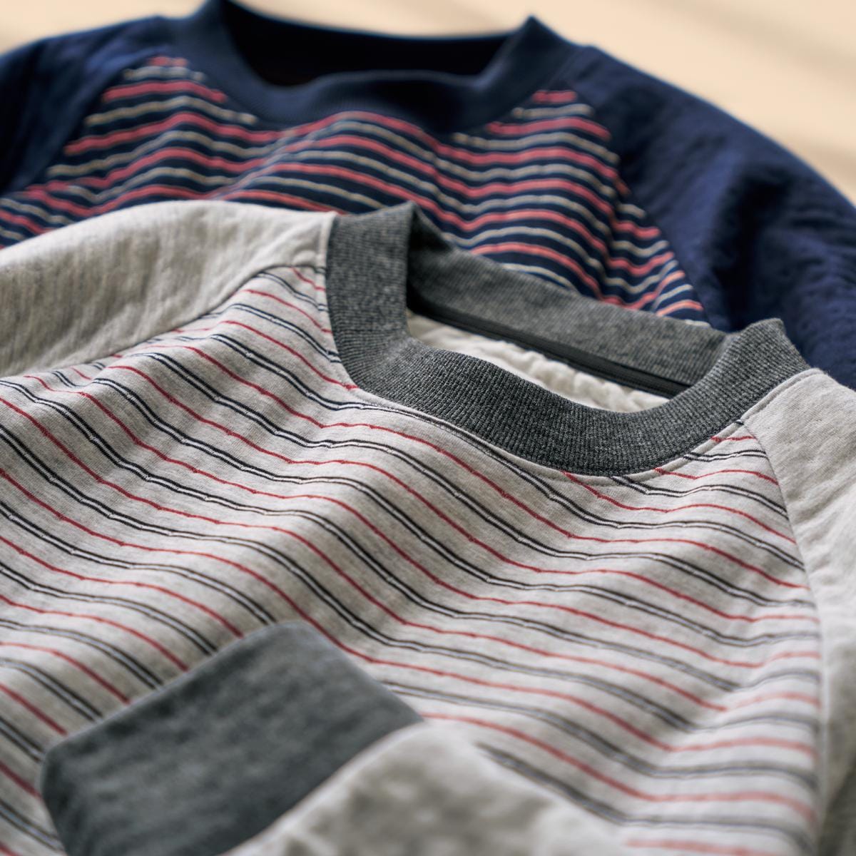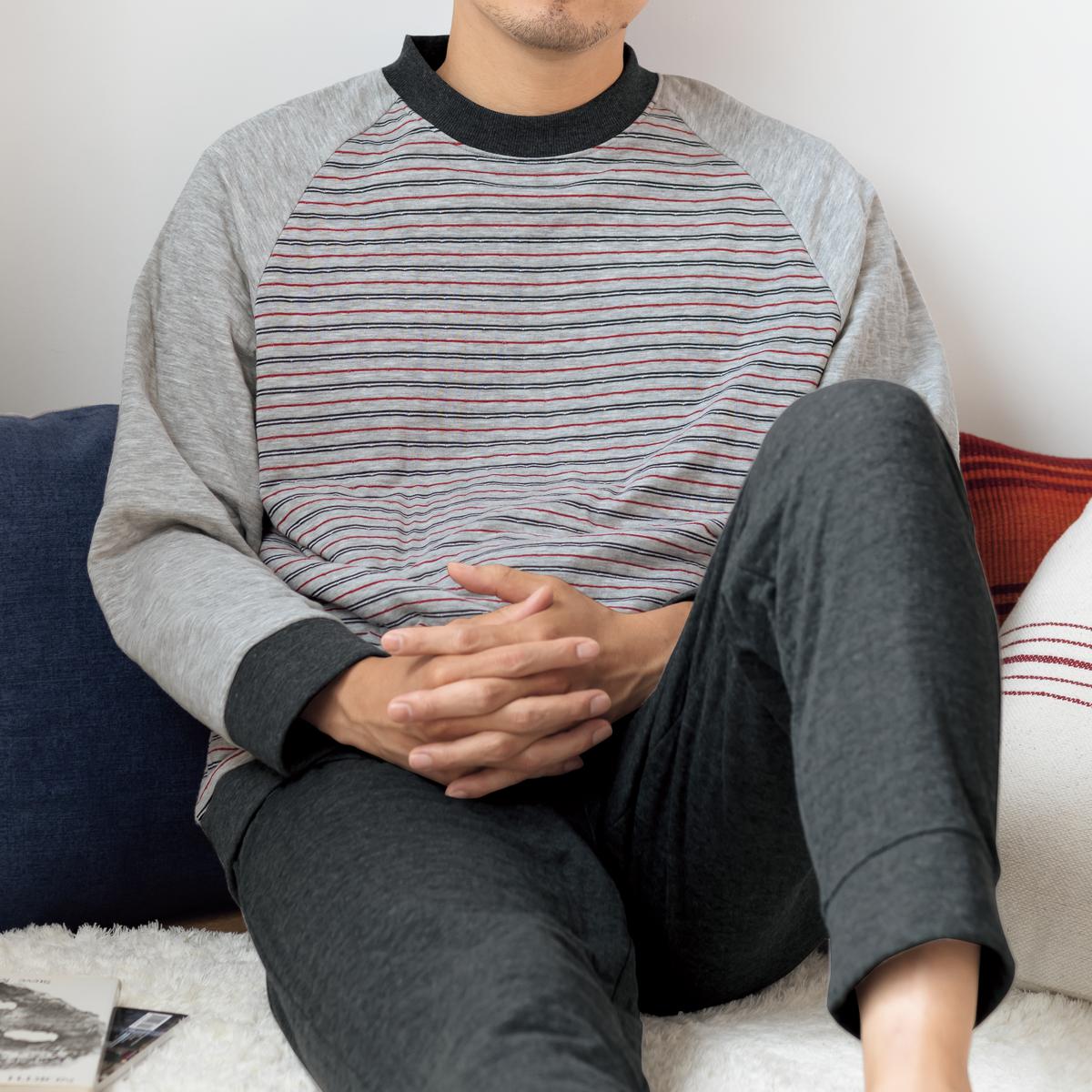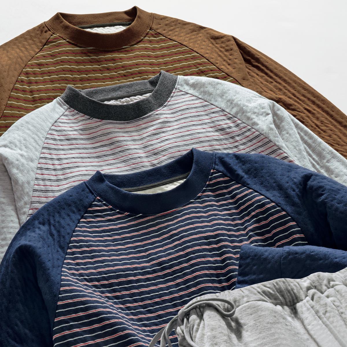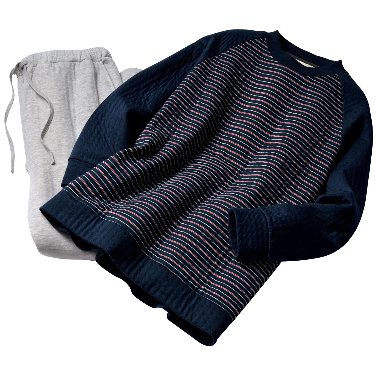 -お買い得ポイント-ボーダー柄がカジュアル感をだしてくれて年齢問わず着れるパジャマです。-デザイン-ラグランスリーブで肩周りが楽ちんです。-素材特徴-薄い中綿をはさみ込んだことで、空気を含んでふんわり温かなキルト素材のパジャマです。肌側は綿100%で柔らかな肌触り。
