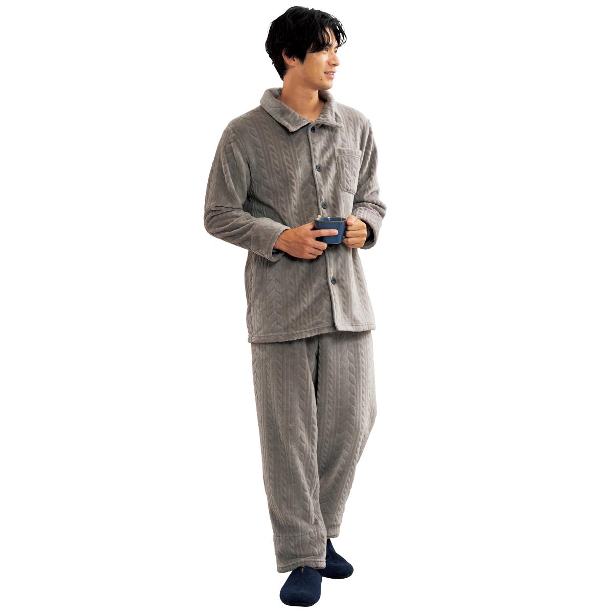 -お買い得ポイント-上品なノルディック柄とカービング模様の組み合わせ、見た目も着心地も温かな北欧風デザイン。シーズンムードが高まるパジャマです。-デザイン-ボタンをとめれば衿はハイネックになってポッカポカ!袖口は2重仕立てでスースーせずに暖か。裾もゴム仕様の2重仕立てで冷気を防ぎます。左胸にポケット付きです。-素材特徴-軽くてやわらかいフリース素材。