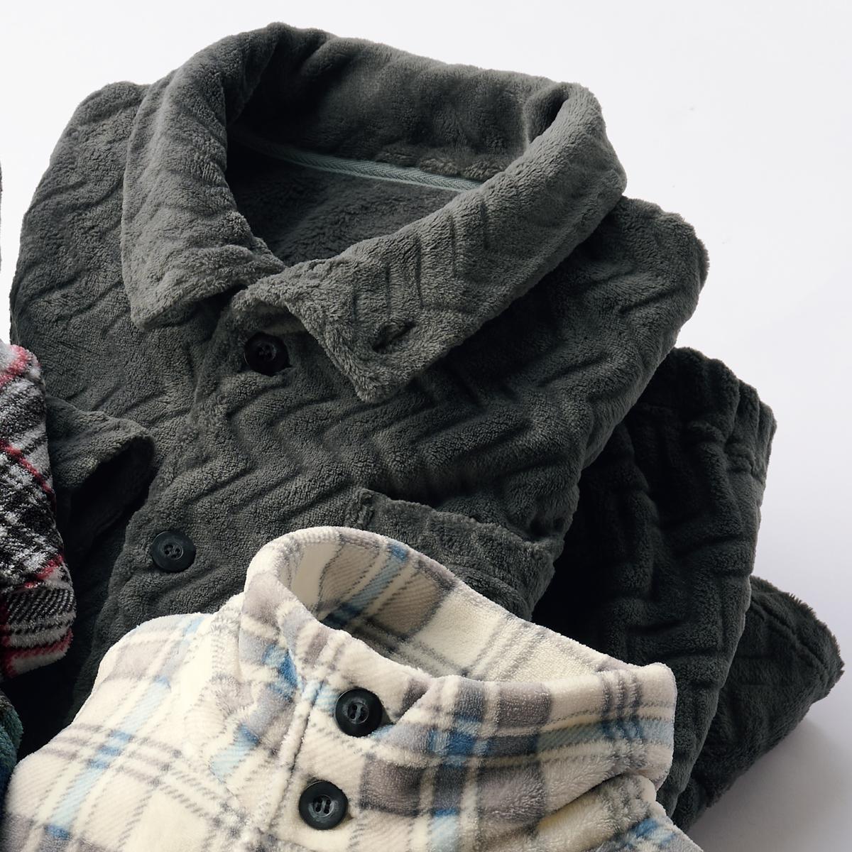-お買い得ポイント-上品なノルディック柄とカービング模様の組み合わせ、見た目も着心地も温かな北欧風デザイン。シーズンムードが高まるパジャマです。-デザイン-ボタンをとめれば衿はハイネックになってポッカポカ!袖口は2重仕立てでスースーせずに暖か。裾もゴム仕様の2重仕立てで冷気を防ぎます。左胸にポケット付きです。-素材特徴-軽くてやわらかいフリース素材。