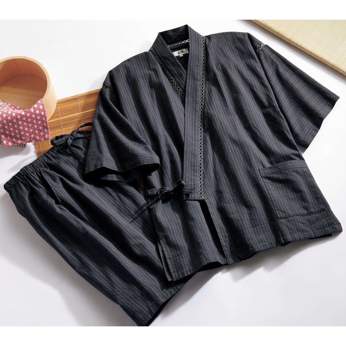 -お買い得ポイント-肩から脇、襟もとにタコ糸を使用した本格仕様。タコ糸の縫い目から風が通り抜けます。-デザイン-上着とパンツの両サイドにポケット付き、ウエストはゴム&スピンドル仕様と機能も充実しています。-素材特徴-独特のシボによりサラッと涼しく、シャリ感のあるしじら織り、ラクで動きやすいです。