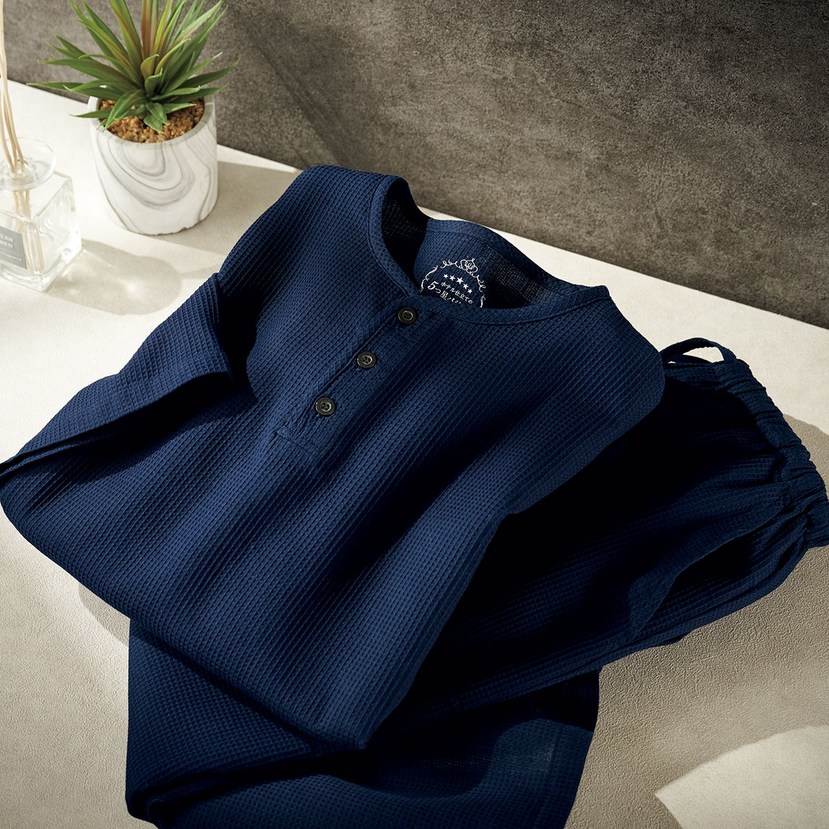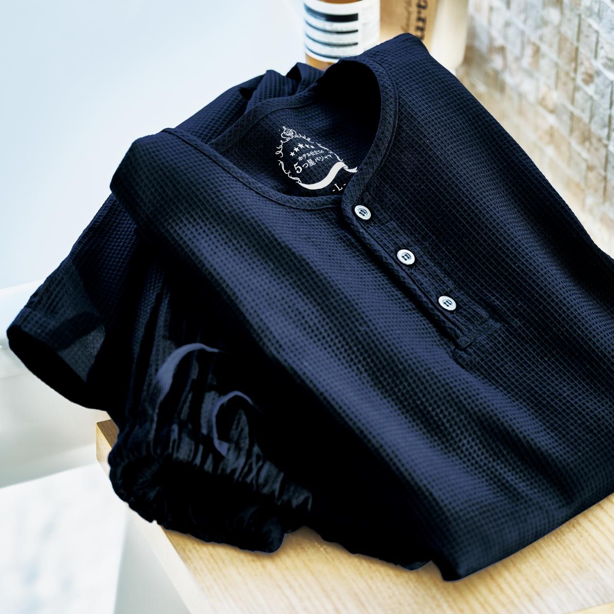 綿100%ワッフル素材は凹凸感がさらっと心地よく、優しい肌ざわり。