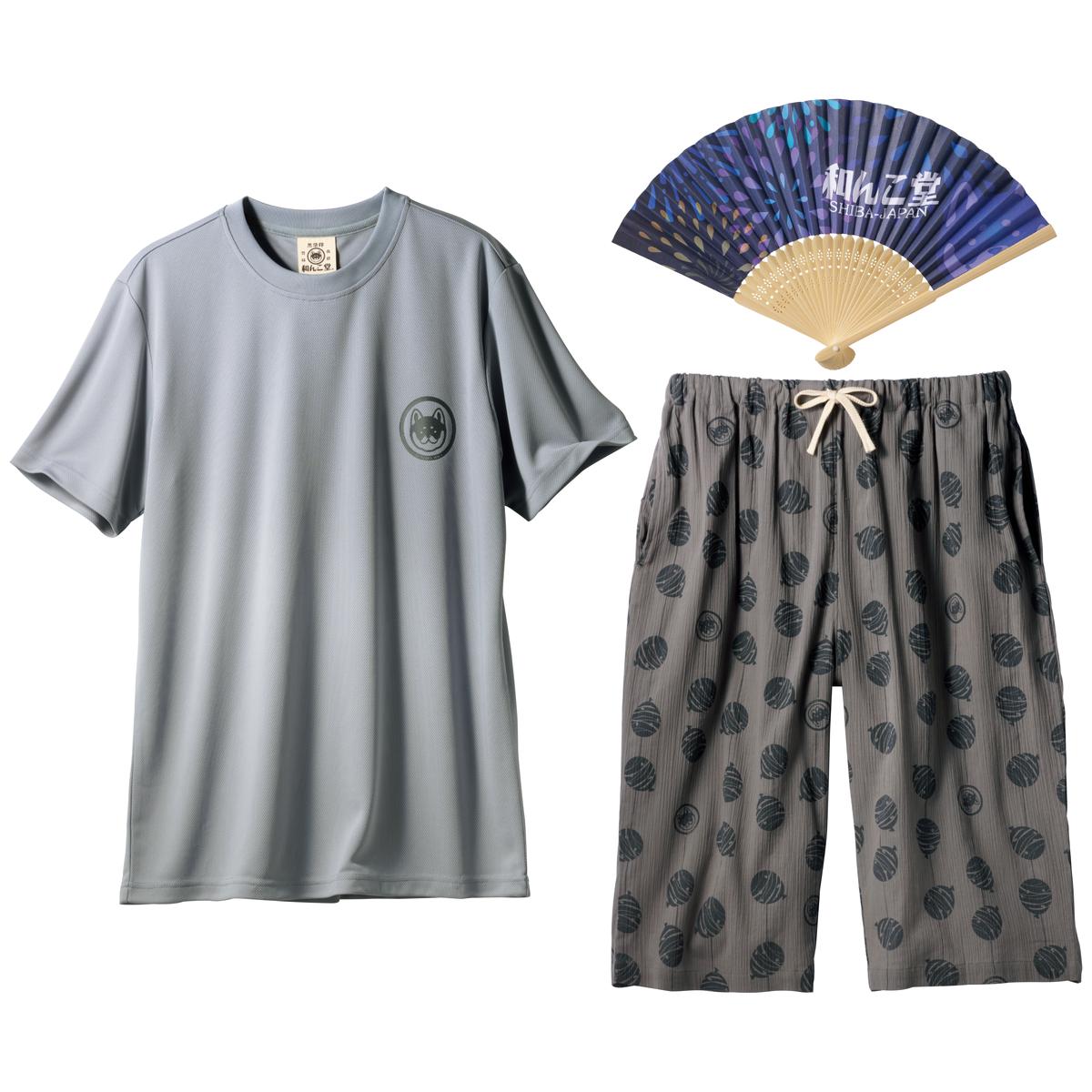 -お買い得ポイント-柴キャラクターが可愛い、メッシュT シャツとさらりとした7分丈パンツに、扇が付いたセットです。ボックス入りでギフトにぴったり!-デザイン-Tシャツは、左胸、柴犬のプリントがアクセントになっています。パンツも短すぎず、長すぎないちょうどいい丈感です。パンツの左右にはポケットが付いています。-素材特徴-T シャツは、通気性に優れたメッシュ素材を使用。