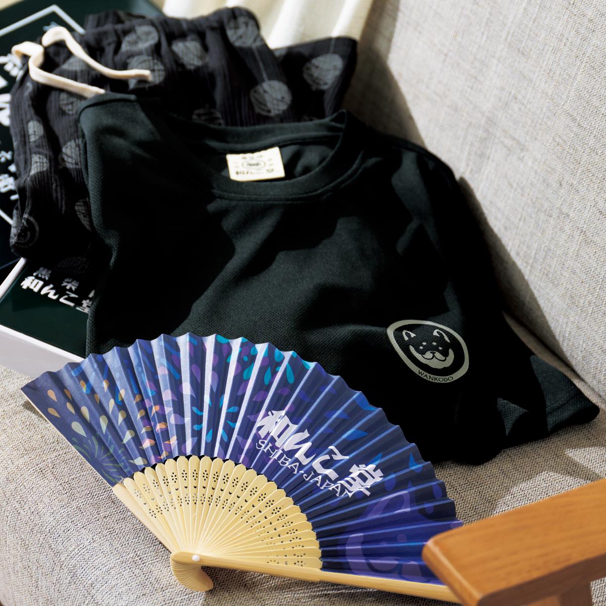 柴キャラクターが可愛い、メッシュT シャツとさらりとした7分丈パンツに、扇が付いたセットです。