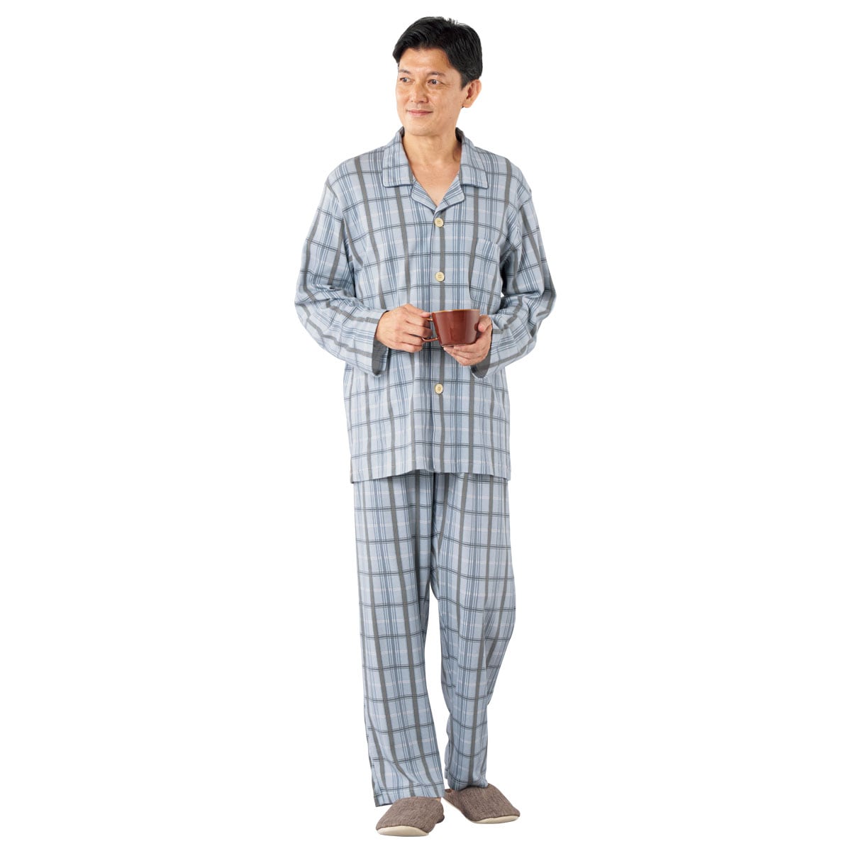 -お買い得ポイント-肌に優しい綿100%素材のシャツパジャマです。ゆったり着られて着心地快適。-デザイン-斜めボタンホールと大きめボタンで脱ぎ着がラク。ウエストは、ゴム仕様で調整ラクラク。アームホールが広めなので、着心地ラクラク。-素材特徴-綿100%素材。肌ざわりが良く、汗をかいても蒸れにくく快適です。