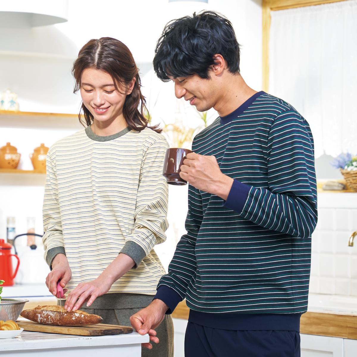 -お買い得ポイント-ボーダーの配色がアクセントに。男性だけでなく、女性にもおすすめです。-デザイン-袖口と裾は冷気の侵入を防ぐ仕様。パンツは、左右ポケット付き。-素材特徴-生地に付着する菌の増殖を抑え、ニオイを防ぐ綿100%素材。ロングシーズン爽やかに着られます。