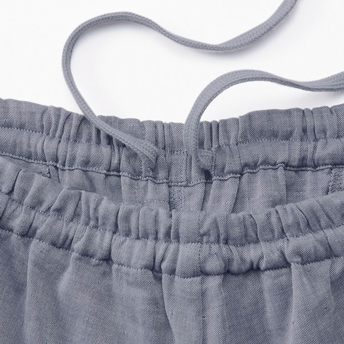 -お買い得ポイント-空気を含んでふわり軽やかストレスなくリラックスできる素材のルームパンツ。-デザイン-細めの2本のゴム入りでウエストも優しい肌あたり、ウエストの締め付け感から解放。スマホもすっぽり入るサイズ感の便利な左右ポケット付き。縫い代が肌にあたらず肌ストレスを軽減。-素材特徴-自由に動いても、つっぱり感を感じないストレッチダブルガーゼ。