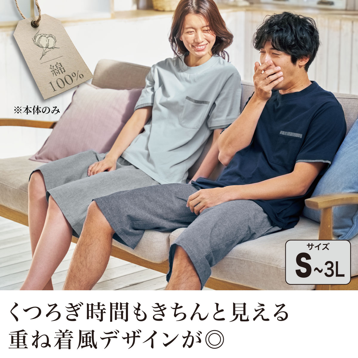 -お買い得ポイント-パジャマ見えしないので、お家でのくつろぎ時間に!-デザイン-Tシャツは洗濯してもよじれにくい仕様。パンツは肌ばなれがよく暑がりさんも快適。-素材特徴-Tシャツはよじれにくい天竺素材。配色部分とパンツはさらっとしたシャンブレー素材。