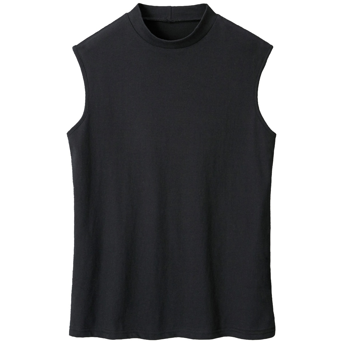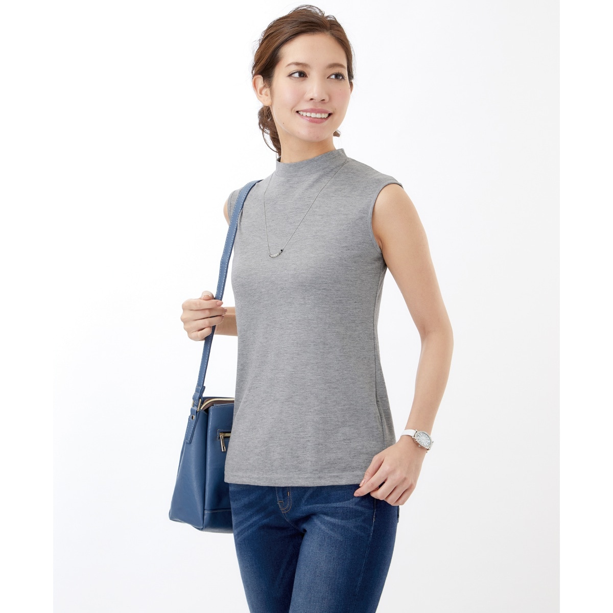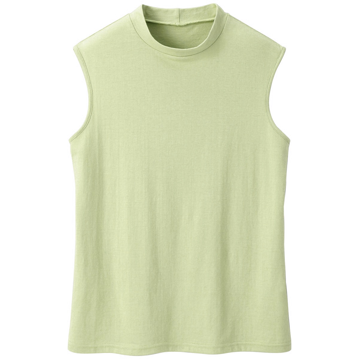 少しハイネックにして気になる首筋をさり気なくカバーできるタンクトップ。透けるチュニックやカーディガン、ジャケットとの重ね着にも◎