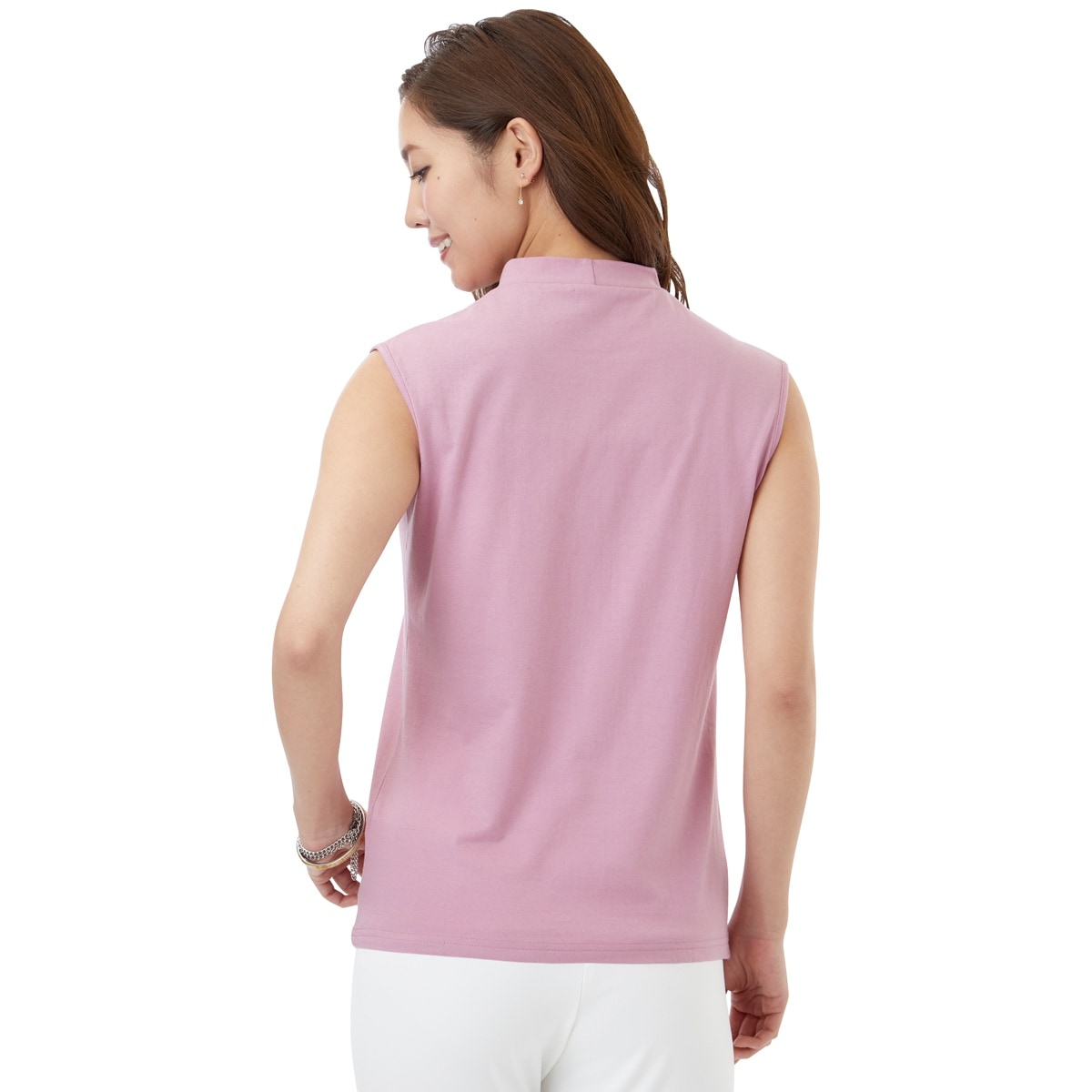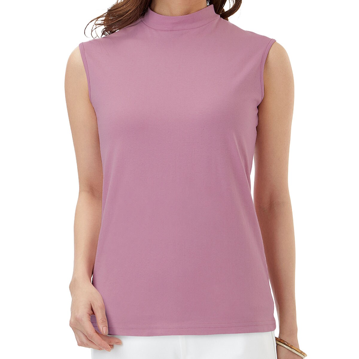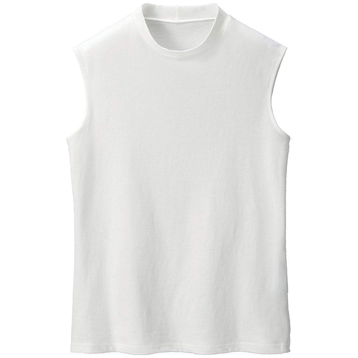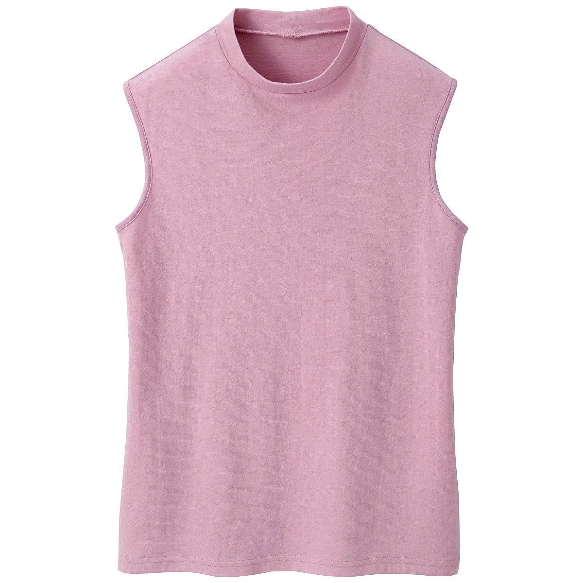 少しハイネックにして気になる首筋をさり気なくカバーできるタンクトップ。透けるチュニックやカーディガン、ジャケットとの重ね着にも◎