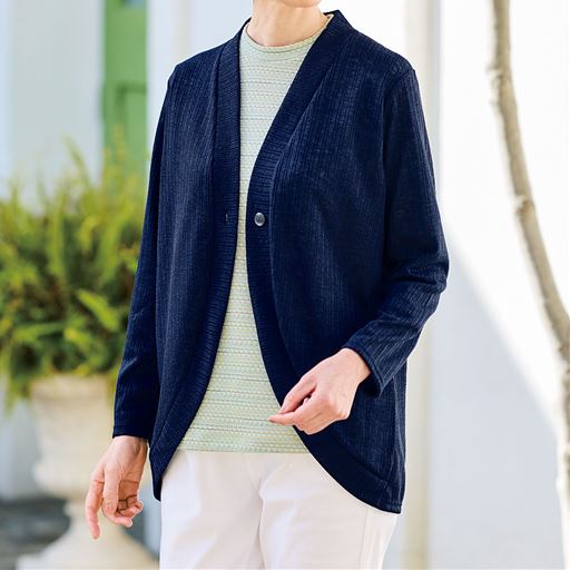 やっぱり羽織りがかかせない!長すぎる夏に重宝する羽織りものは?腰まわりやヒップが隠れる丈感がポイントの透かし編みカーディガン。軽い着心地で冷房対策にもおすすめです。-POINT-軽量でシワが目立ちにくく、たたんで旅行やお出かけの携帯にも便利。ーデザインー前裾をラウンドさせた着合わせしやすいシルエットで、高さのある後ろ衿デザインが首元を覆い、日射しからカバー。