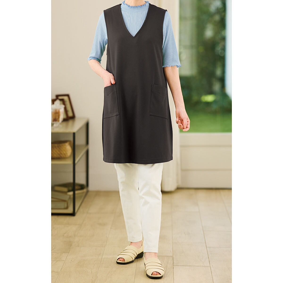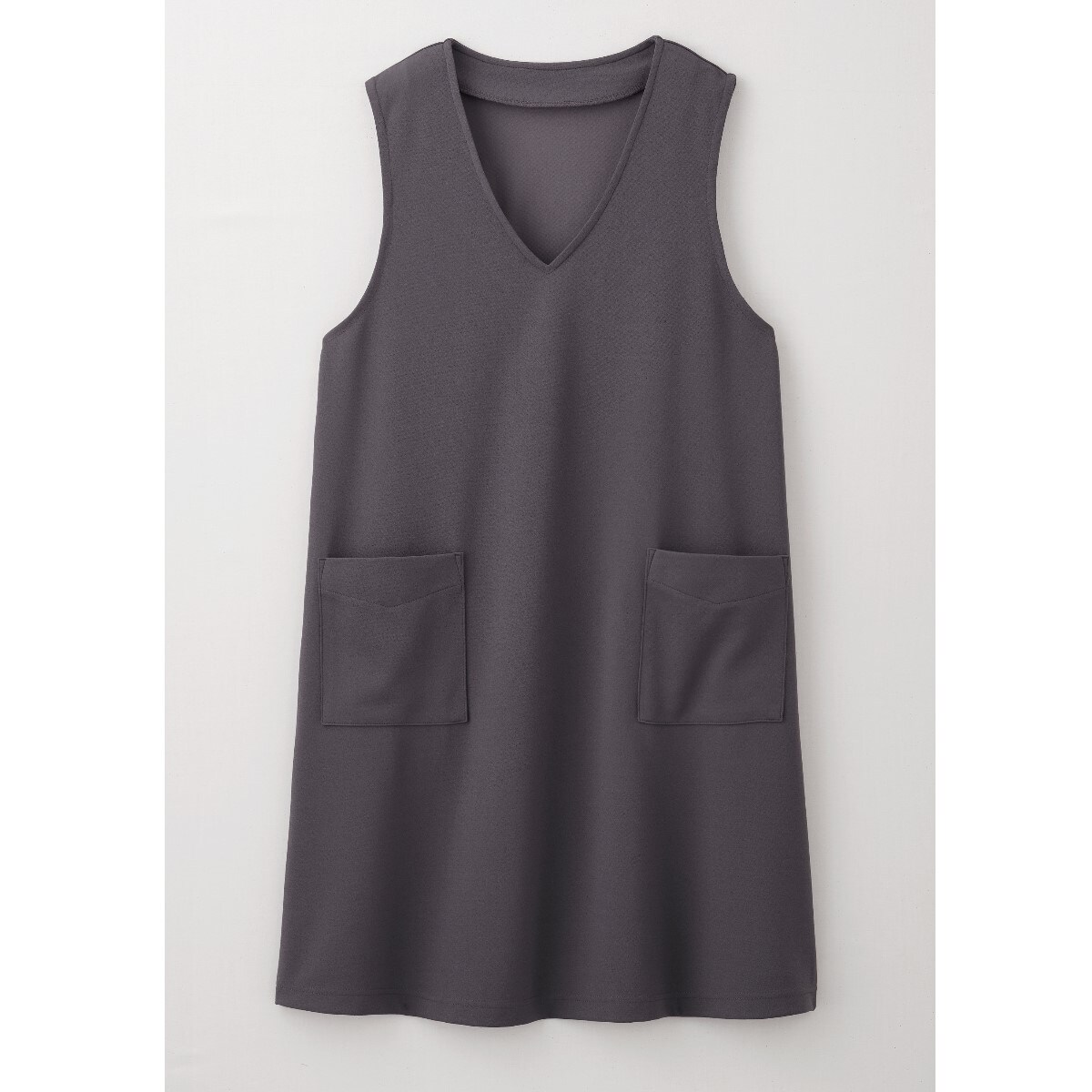 ストンと被るだけでおしゃれに決まる!ナチュラルな風合いの麻調素材が深めのVネックですっきり見え。程よいゆとりのAラインシルエットは、ラクに着られて体型カバーにもひと役。インナー次第でロングシーズン活躍します。-デザイン-スマホがすっきり入る便利な大きめポケット付き。-素材特性-UVカット率約95%!タテヨコストレッチのカットソー素材でラクな着心地。