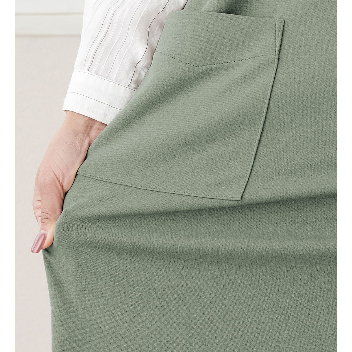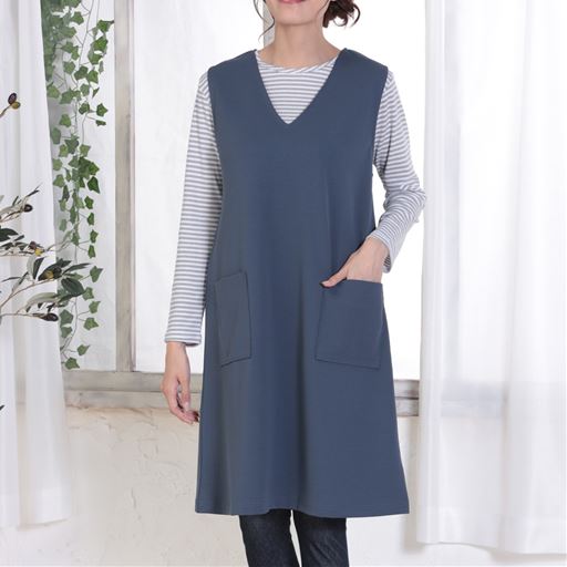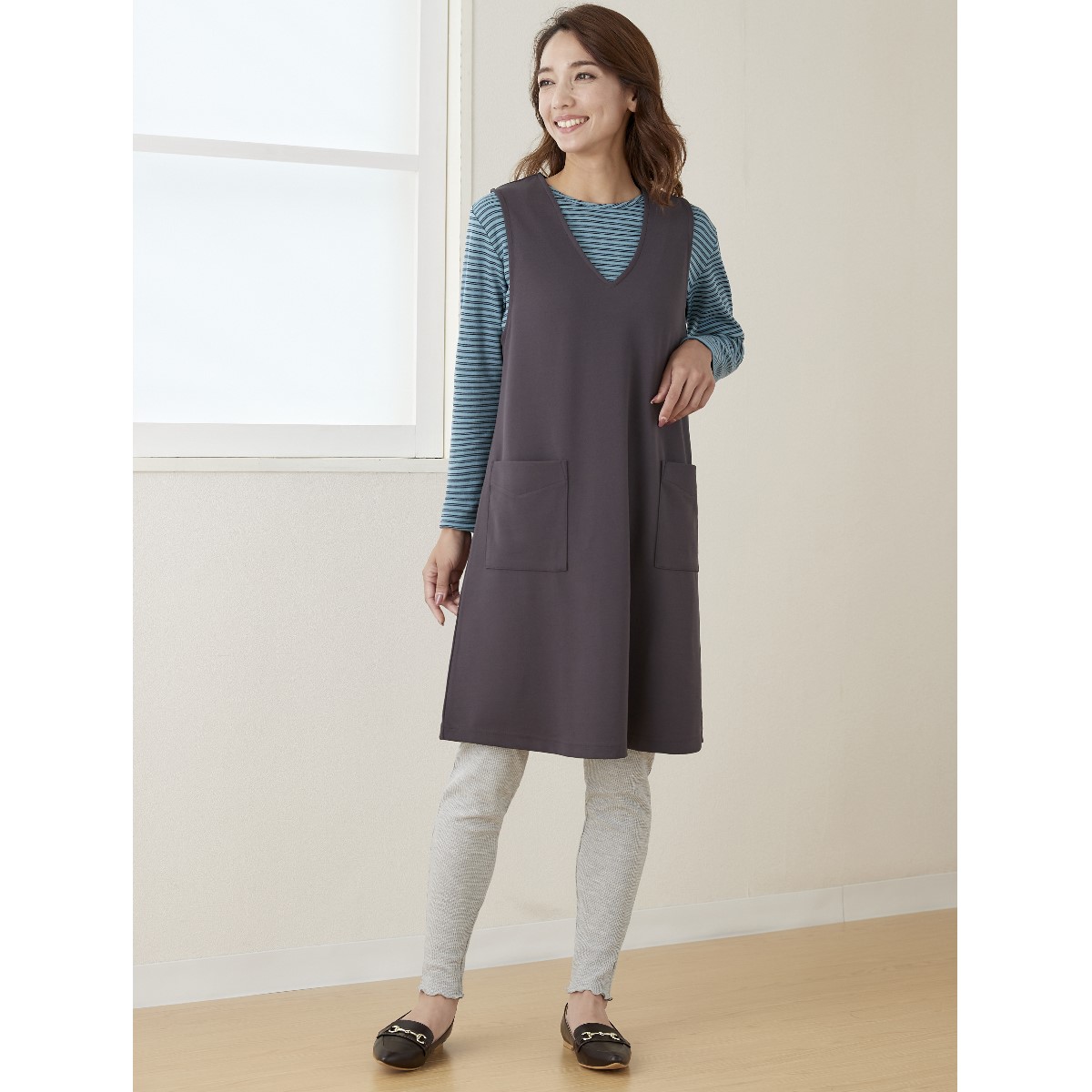 重ねたら いつものコーデが 見違える!ストンと被るだけでおしゃれに決まるジャンパースカート。ラクに着られて体型カバーにもひと役。インナー次第でロングシーズン活躍します。ーデザインーナチュラルな風合いの麻調素材が深めのVネックですっきり見え。程よいゆとりのAラインシルエットは、ラクに着られて体型カバーにもひと役。スマホがすっきり入る便利な大きめポケット付き。ー素材特性ータテヨコストレッチのカットソー素材でラクな着心地。【UVカット率約95%】