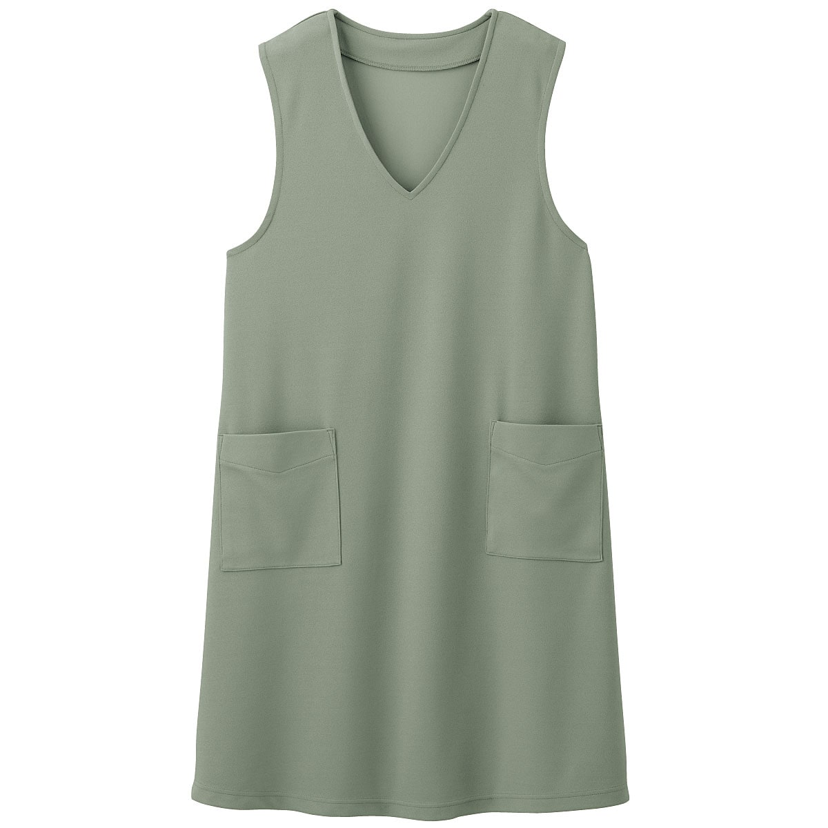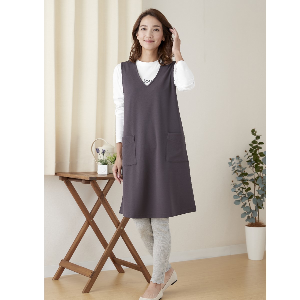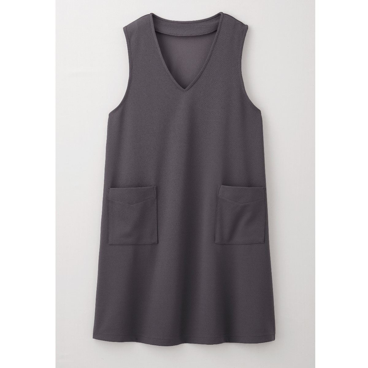 重ねたら いつものコーデが 見違える!ストンと被るだけでおしゃれに決まるジャンパースカート。ラクに着られて体型カバーにもひと役。インナー次第でロングシーズン活躍します。ーデザインーナチュラルな風合いの麻調素材が深めのVネックですっきり見え。程よいゆとりのAラインシルエットは、ラクに着られて体型カバーにもひと役。スマホがすっきり入る便利な大きめポケット付き。ー素材特性ータテヨコストレッチのカットソー素材でラクな着心地。【UVカット率約95%】