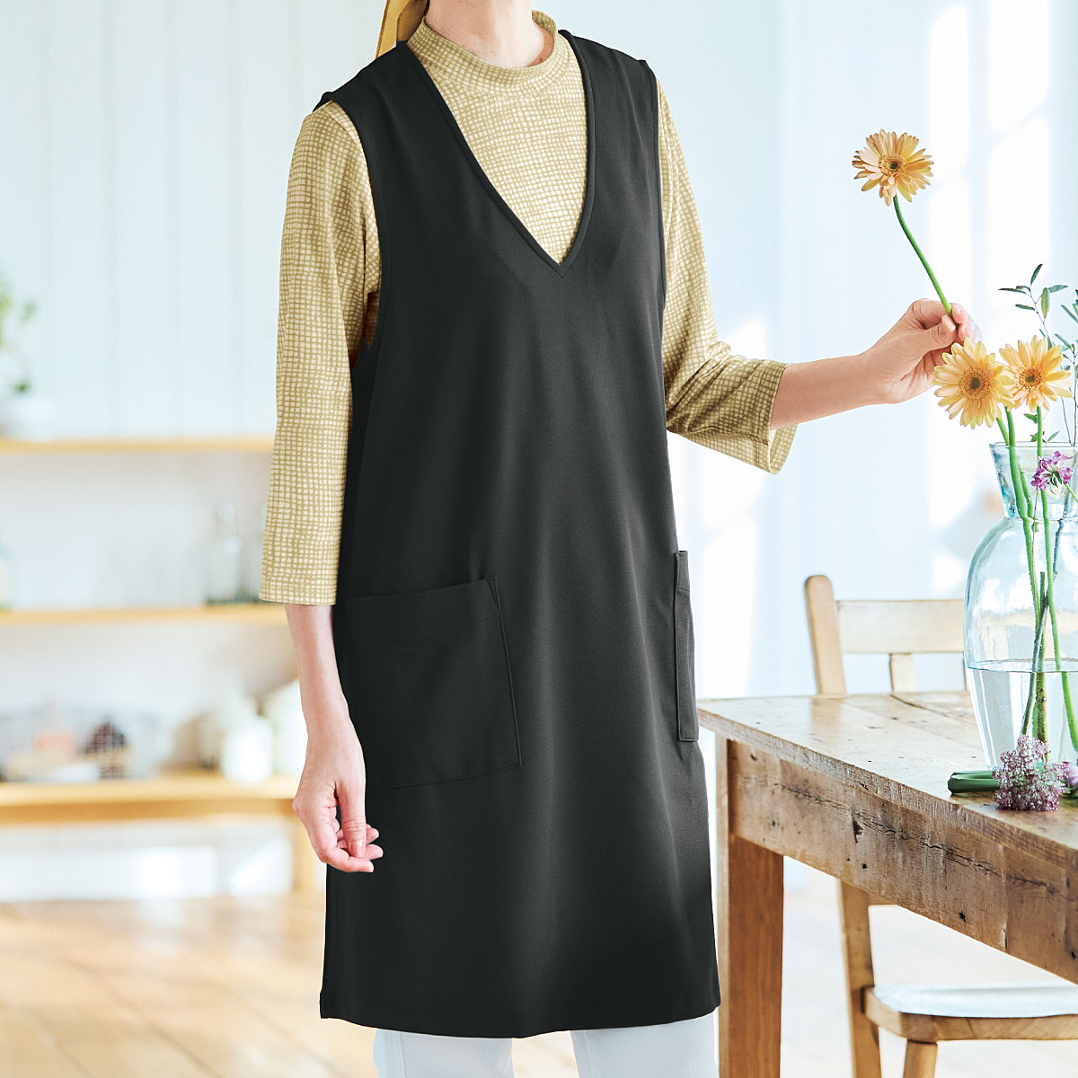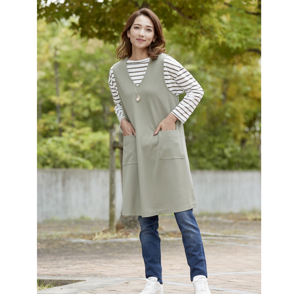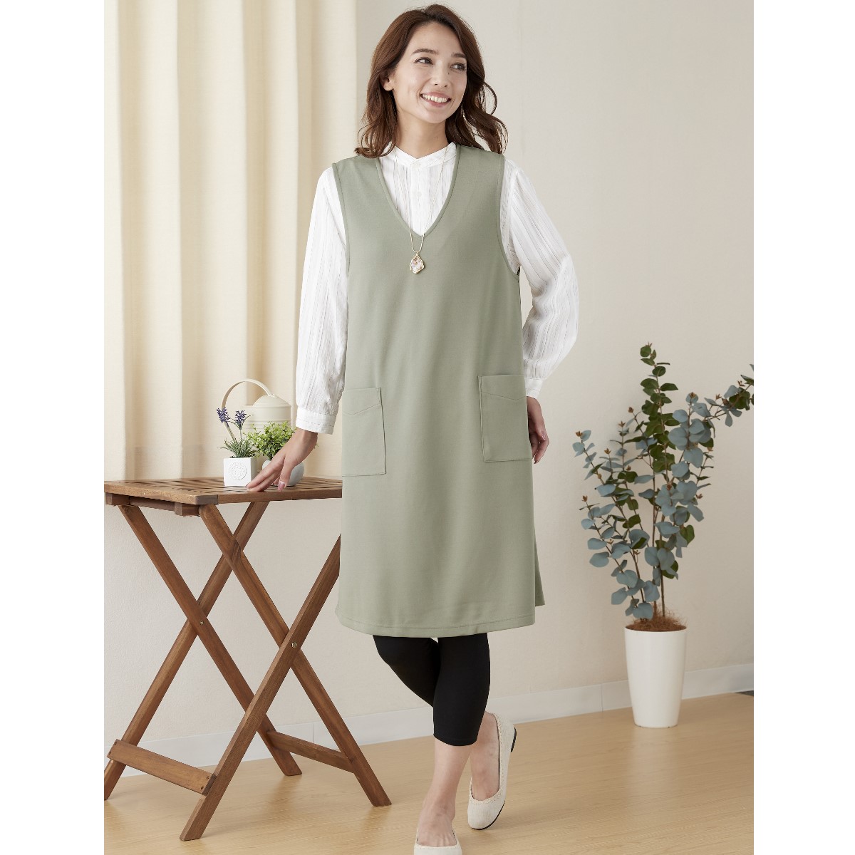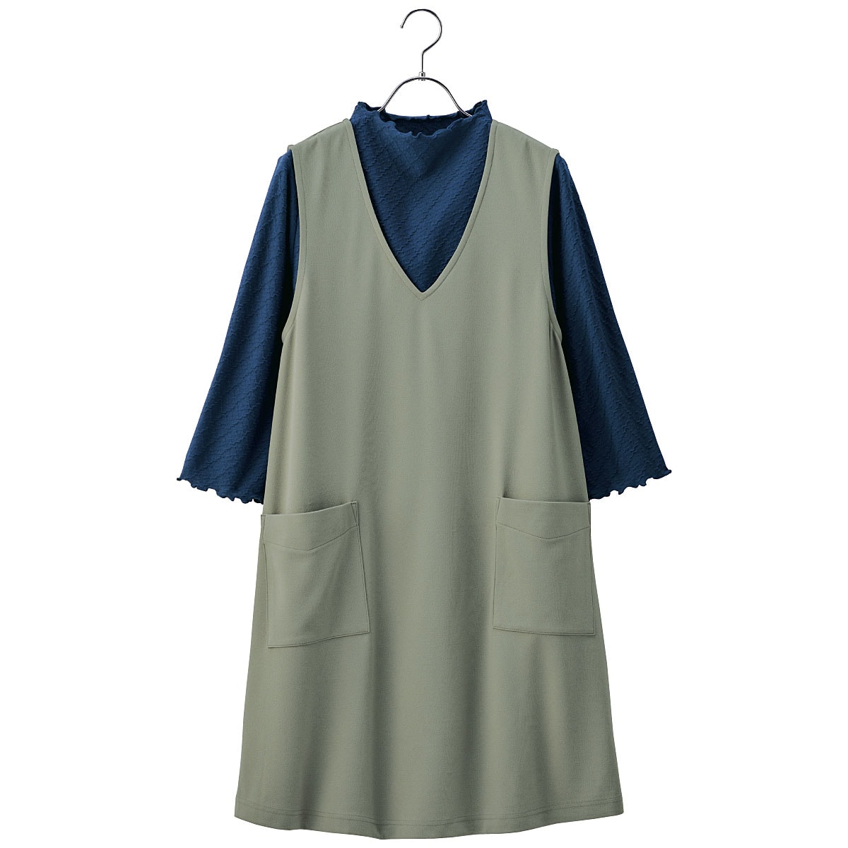 重ねたら いつものコーデが 見違える!ストンと被るだけでおしゃれに決まるジャンパースカート。ラクに着られて体型カバーにもひと役。インナー次第でロングシーズン活躍します。ーデザインーナチュラルな風合いの麻調素材が深めのVネックですっきり見え。程よいゆとりのAラインシルエットは、ラクに着られて体型カバーにもひと役。スマホがすっきり入る便利な大きめポケット付き。ー素材特性ータテヨコストレッチのカットソー素材でラクな着心地。【UVカット率約95%】