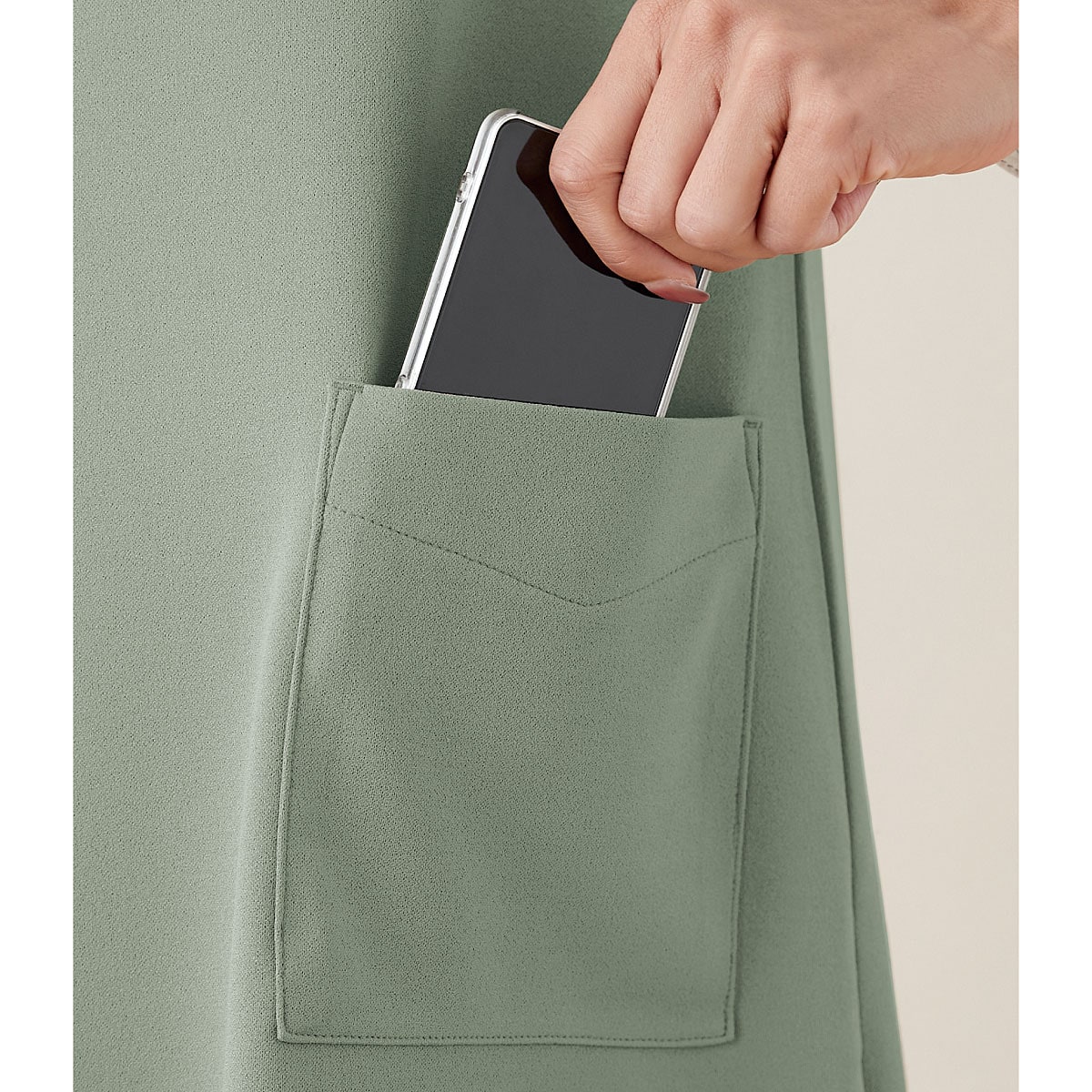スマホがすっきり入る便利な大きめポケット付き。