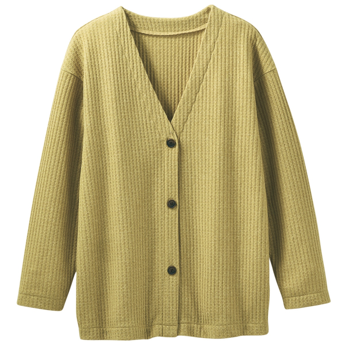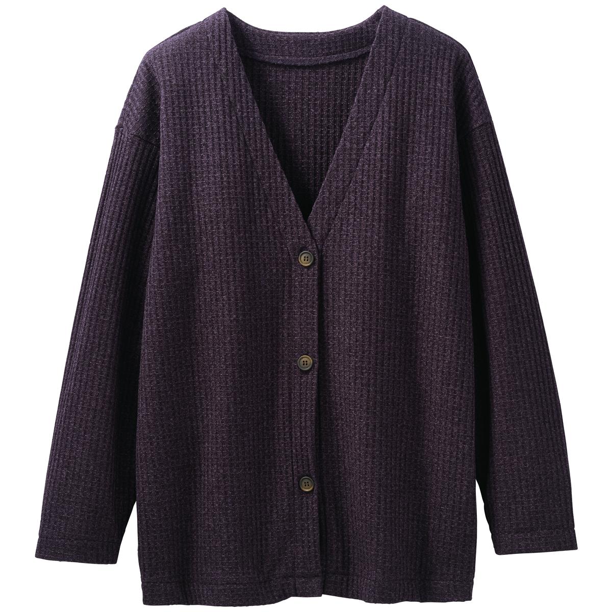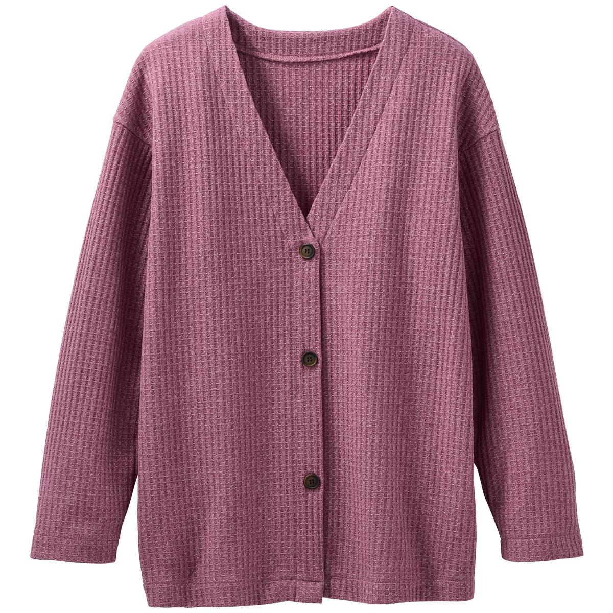 気温調節やおでかけにサッと1枚気軽に着られるカーディガンが重宝!おしりがすっぽり隠れる丈感で、体型隠しにも。ー素材特性ー保温性のよい「エアロウォーム」を使用し、軽やかな着心地であったか。軽量なので肩に負担がかかりにくく快適。ワッフル調に編み上げた程よい厚みのある生地。