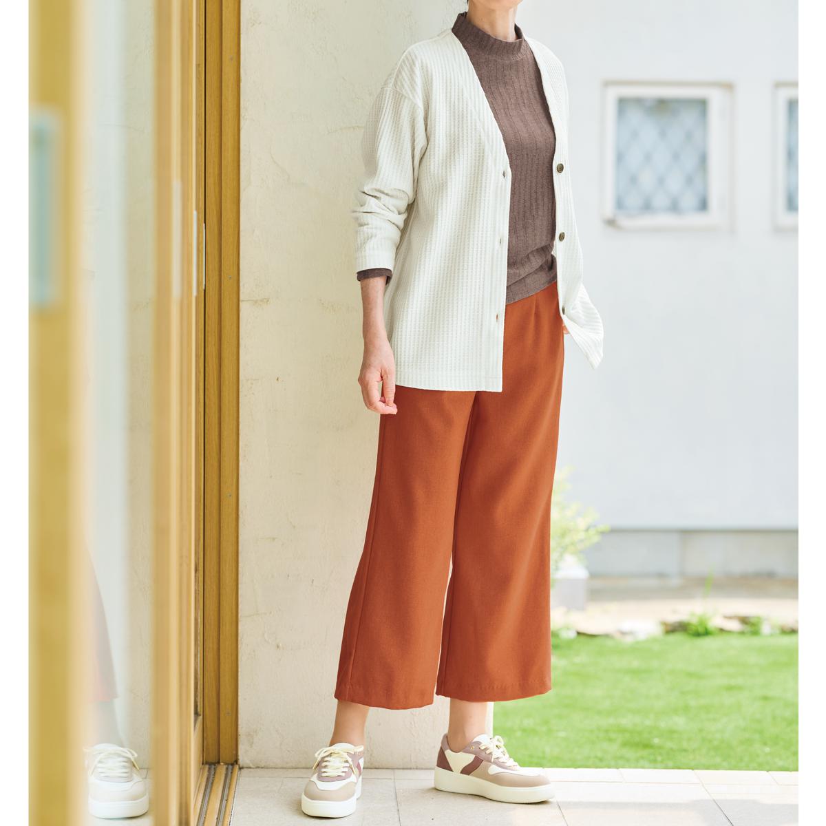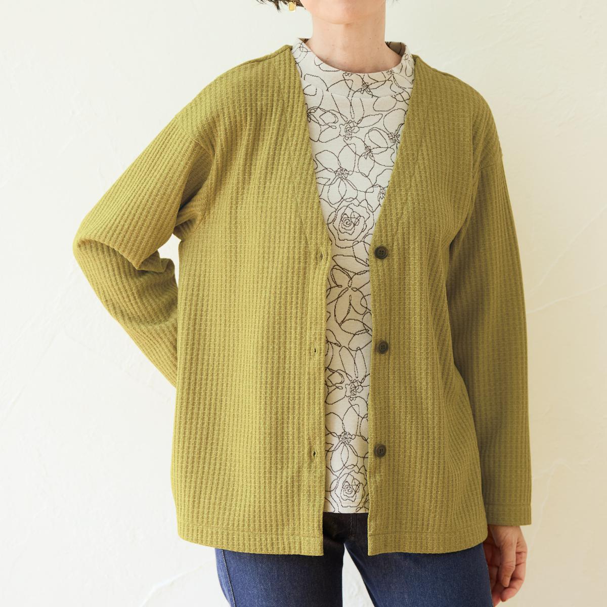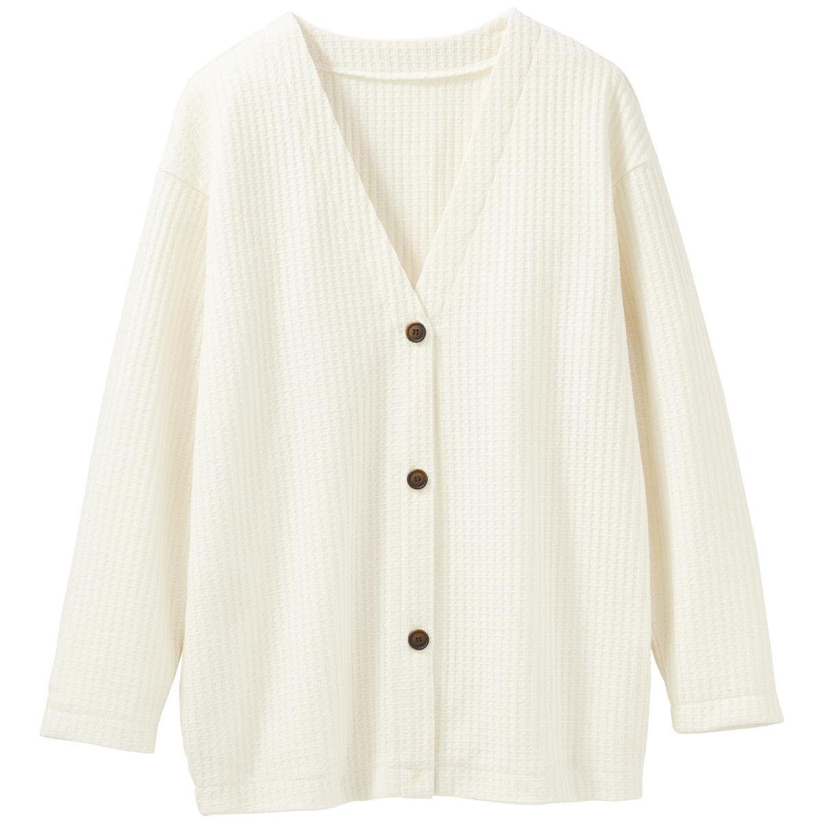 気温調節やおでかけにサッと1枚気軽に着られるカーディガンが重宝!おしりがすっぽり隠れる丈感で、体型隠しにも。ー素材特性ー保温性のよい「エアロウォーム」を使用し、軽やかな着心地であったか。軽量なので肩に負担がかかりにくく快適。ワッフル調に編み上げた程よい厚みのある生地。