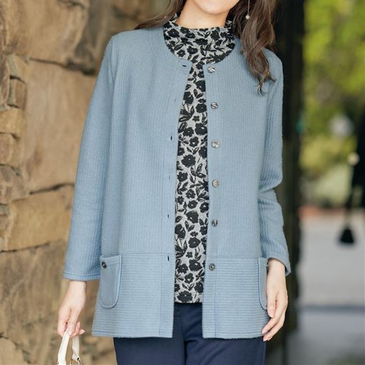 ふんわり軽くてあたたかいリブジャケット。ーこだわりPOINTータテヨコに切り替えたリブ生地や、切り替え部分のプチポケットで無地ジャケットを表情豊かに。明るい色目で顔映えもおまかせです。ー素材特性ーストレッチ性が高く、脱ぎ着のしやすいカットソー素材。