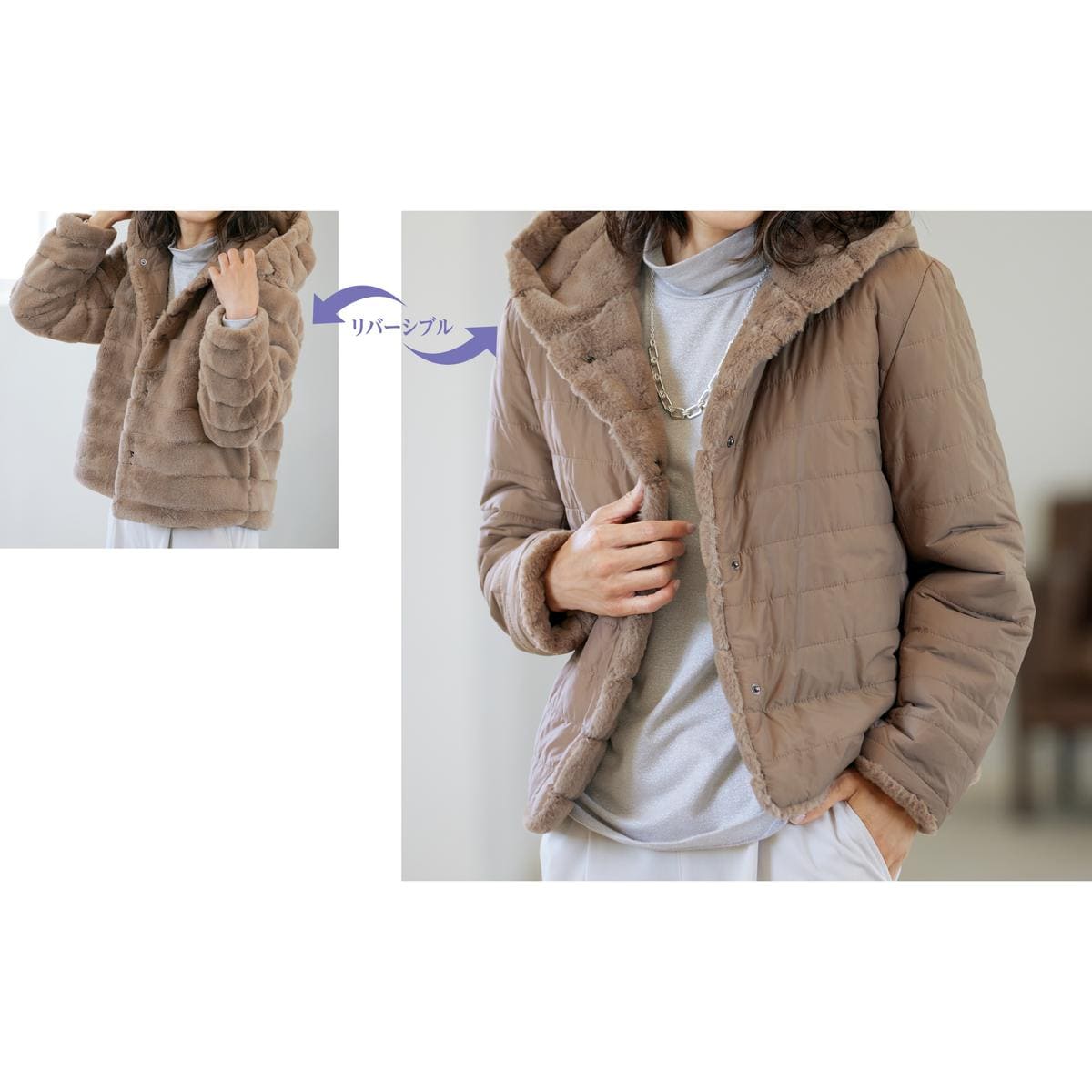 華やぎ感に魅了される両面主役のリバーシブルショートコート。ーこだわりPOINTーふわふわのエコファーと、中わた入りキルトの2通り使える優秀アウター。どちらが表になっても、おしゃれ見えして暖かな着心地です。