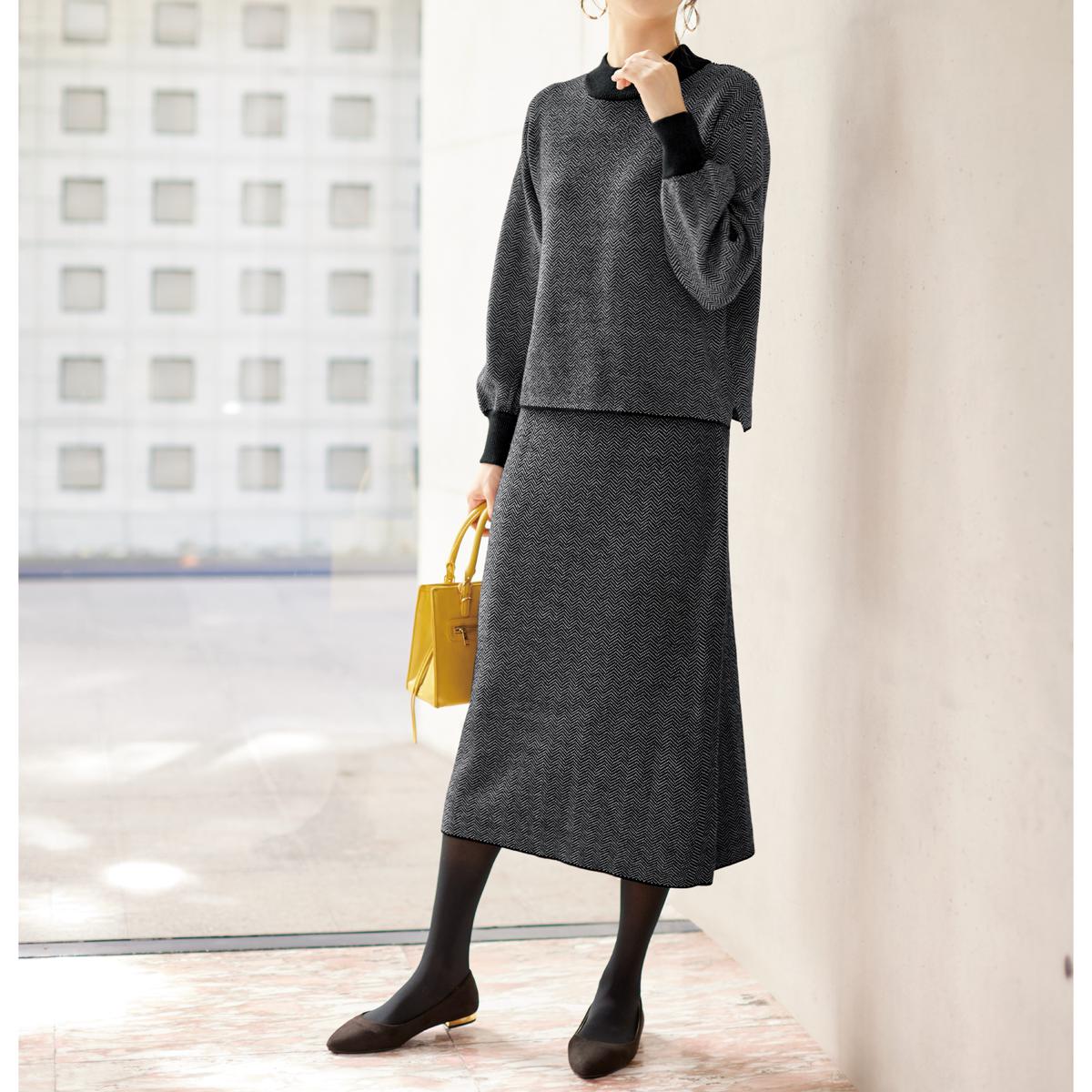 旅行や帰省にも大活躍するニットセットアップ!シックで上品な大人の着こなしにも、カジュアルなコーディネートにも。ーデザインー単品でも着回しやすいシンプルデザインのヘリンボーン柄ニット。スカートはウエストゴム仕様で楽ちん。ー素材特性ーストレッチ性に優れ、春先まで活躍するちょうど良い厚みのニット。【2点セット】・プルオーバー・スカート