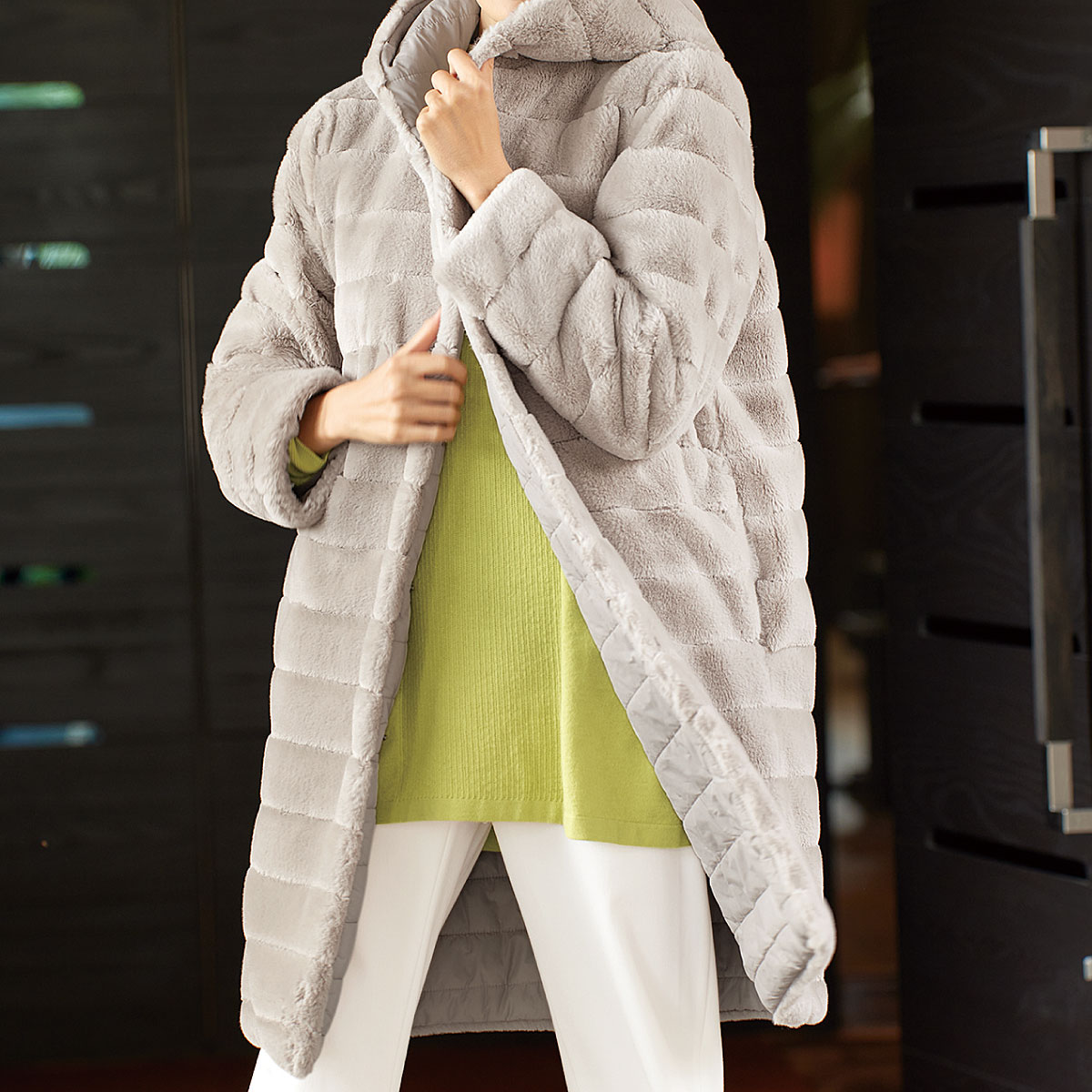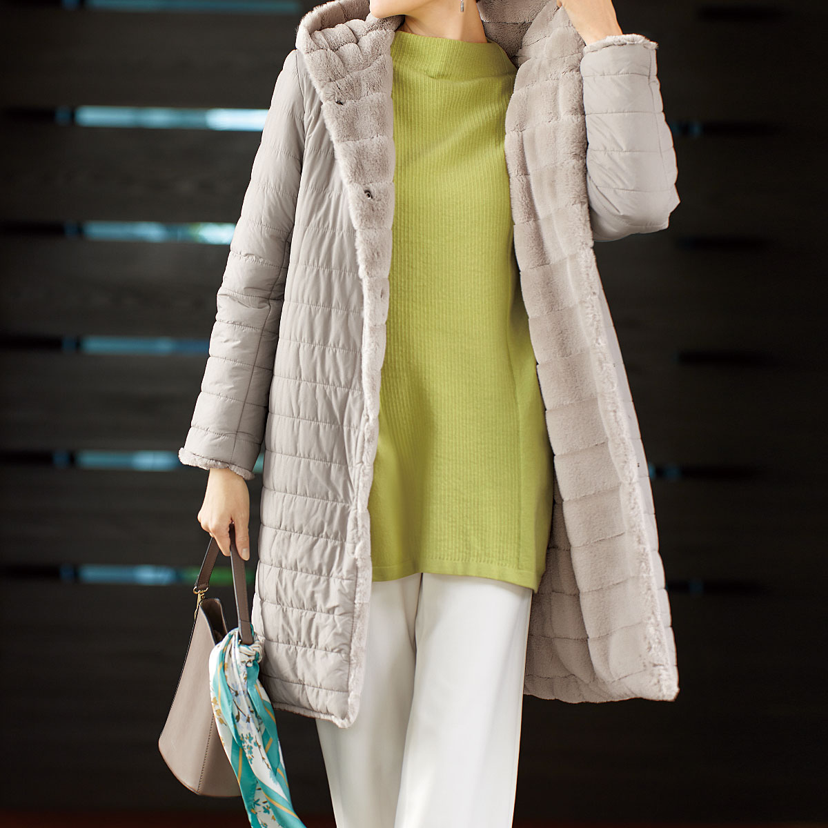 去年大ヒット!即完売したコートが今年も登場。肌ざわりの良いボーダー状のエコファーと、ボーダーキルトの中わたのリバーシブル。カジュアルにもきれいめにも多様なシーンで使える優秀さが魅力です。ーデザインーどちらの面でも使用可能な左右ポケット付き。