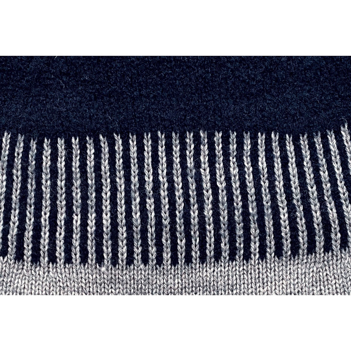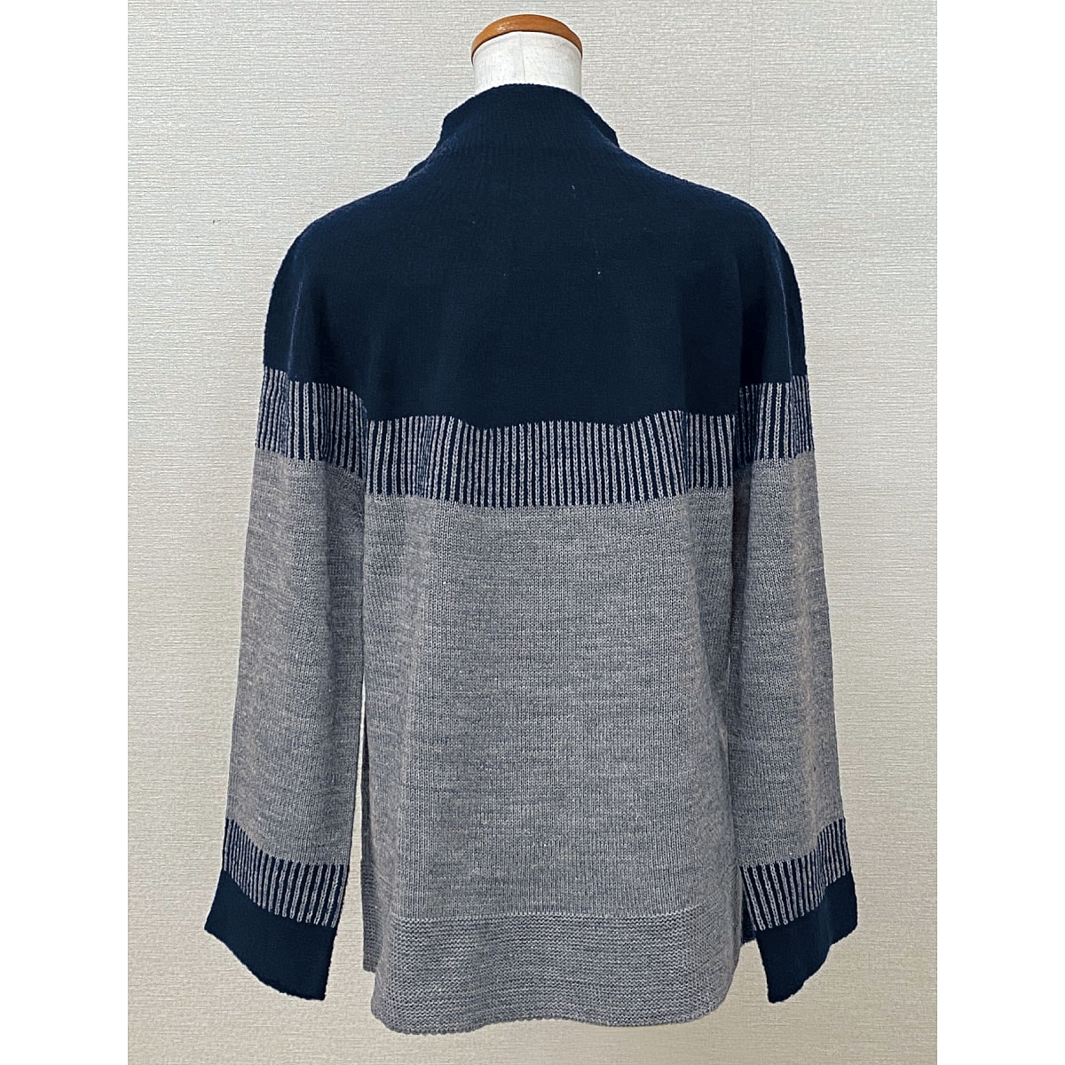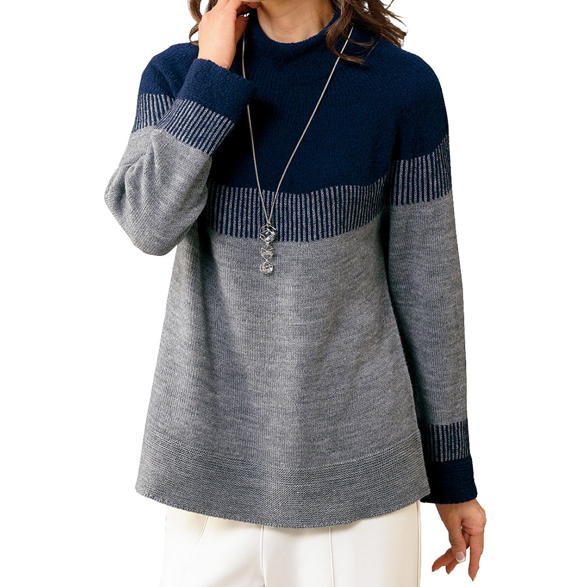 襟まわりと袖口はふわふわの糸を使用して見え方を変えた、ハイネックで温もりのあるセーター。ーこだわりPOINTー編み方を変えた裾部分とAラインのシルエットで体型カバー効果も。ネイビーとグレーの配色がシックでおしゃれ。【ホールガーメント®とは】縫い目がない製法で仕上げているので、肌触りがなめらかでストレッチ性が高く体が動かしやすい。