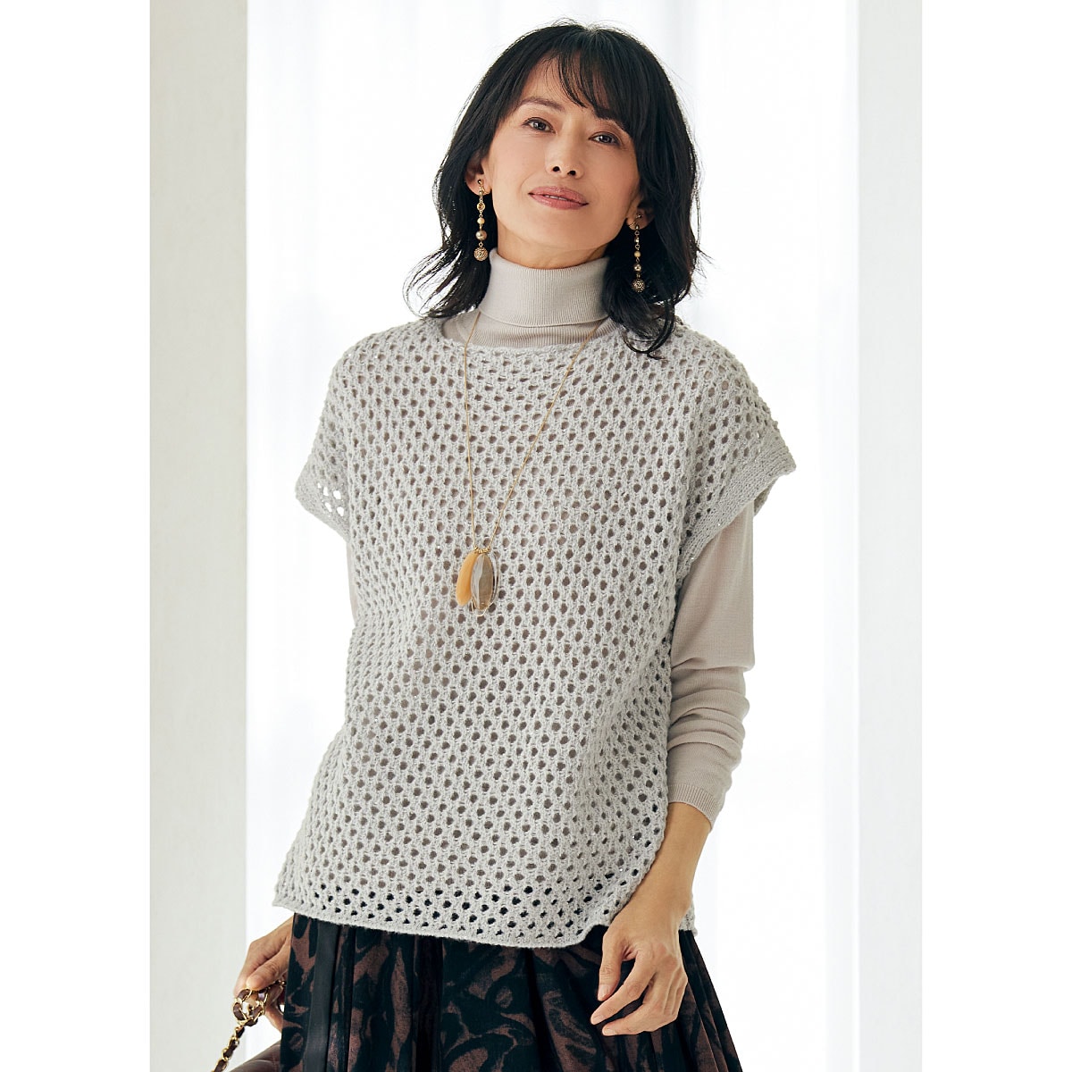 ほんのり煌めくスパンコールとラメ糸が、華やぎとぬくもりを感じさせるメッシュ編みベスト。-デザイン-気になる二の腕をさりげなくカバーします。-素材特性-ウール調のぬくもりのある糸でざっくりと編み上げています。ちくちくしにくくふんわりとした着心地です。