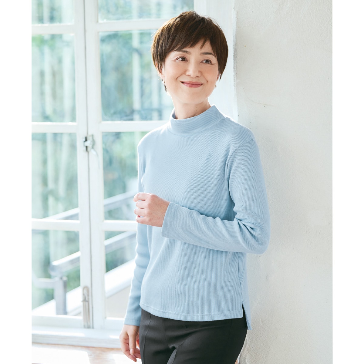 シルキーなツヤ感で1枚でも重ね着でも華やか!細リブ仕立てでニット見えするきれいめカットソープルオーバー。ハイネックデザインや程よいフィットシルエットは、エレガントにもカジュアルにも着こなし自在。-素材特性-しなやかで伸縮性がある東レのシルック®素材は、上品な光沢感が魅力。