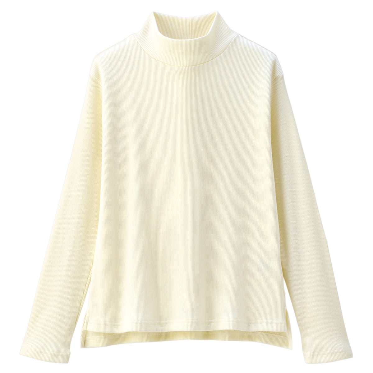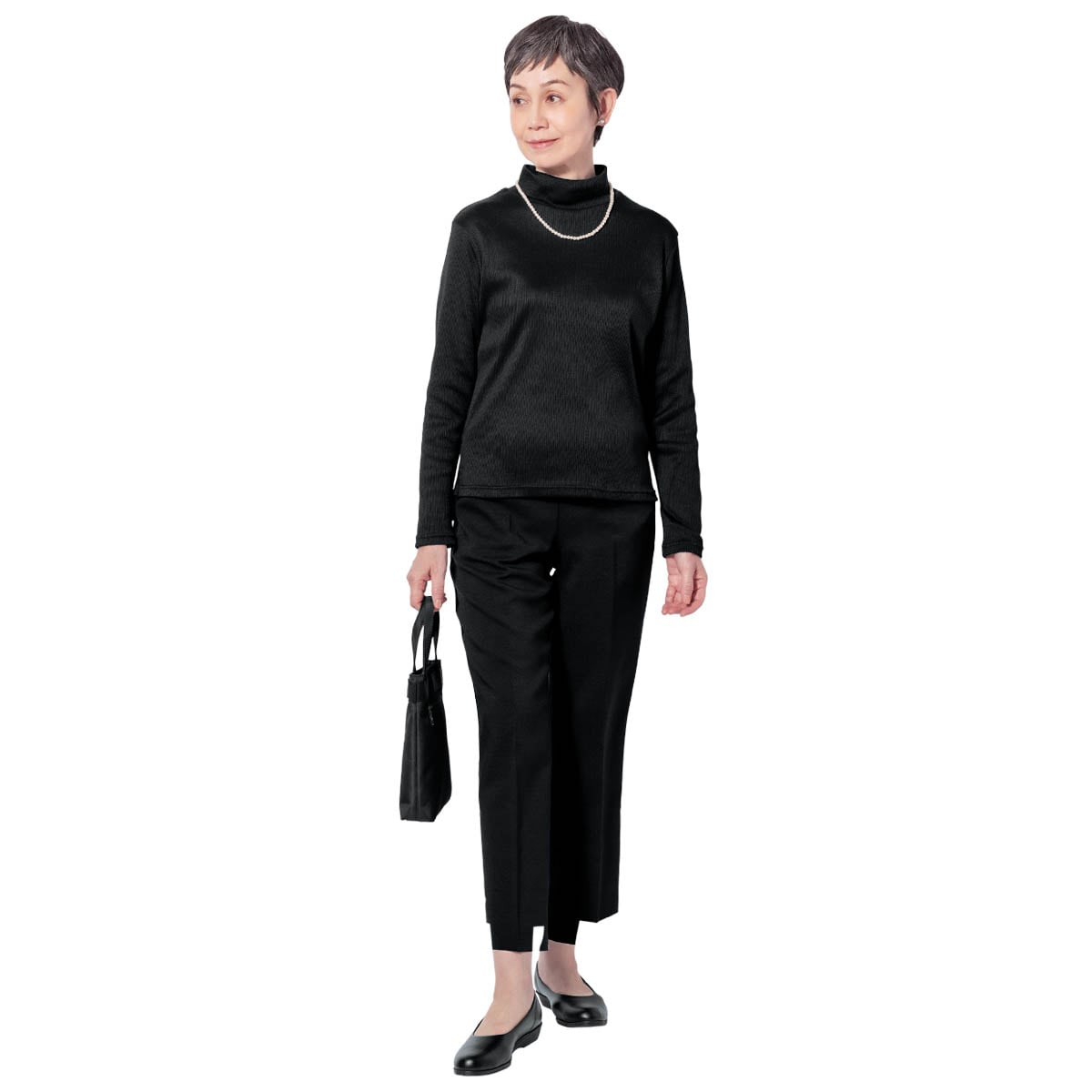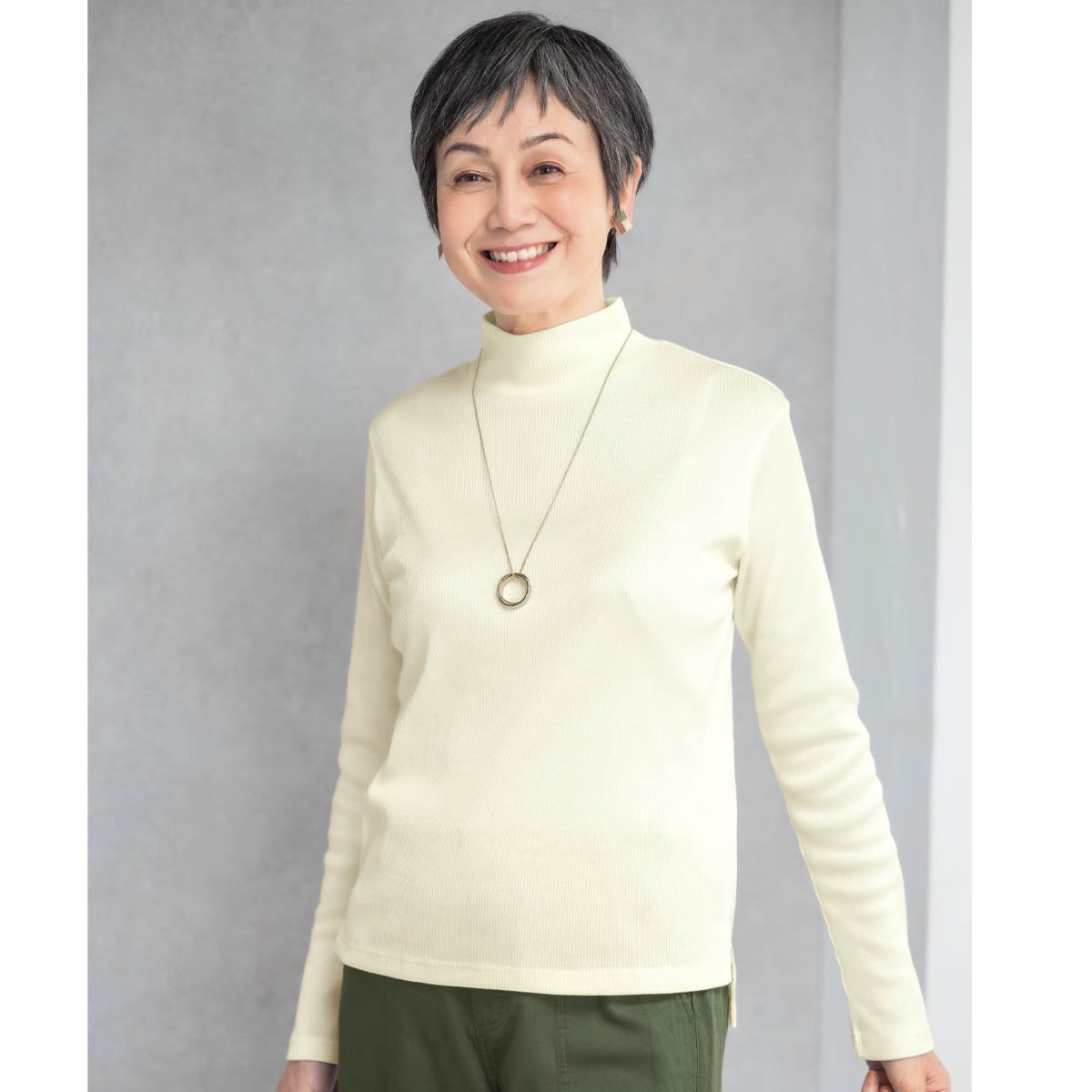 シルキーなツヤ感で品よくきれい魅せ。ブラックパンツ合わせでライトフォーマルにも。ーデザインー細リブ仕立てでニット見えするカットソープルオーバー。ハイネックデザインが気になる首元をカバー。程よいフィットシルエットで1枚でもインナーとしてもすっきり見えます。ー素材特徴ーしなやかで伸縮性がある東レのシルックR素材は、上品な光沢感が魅力。