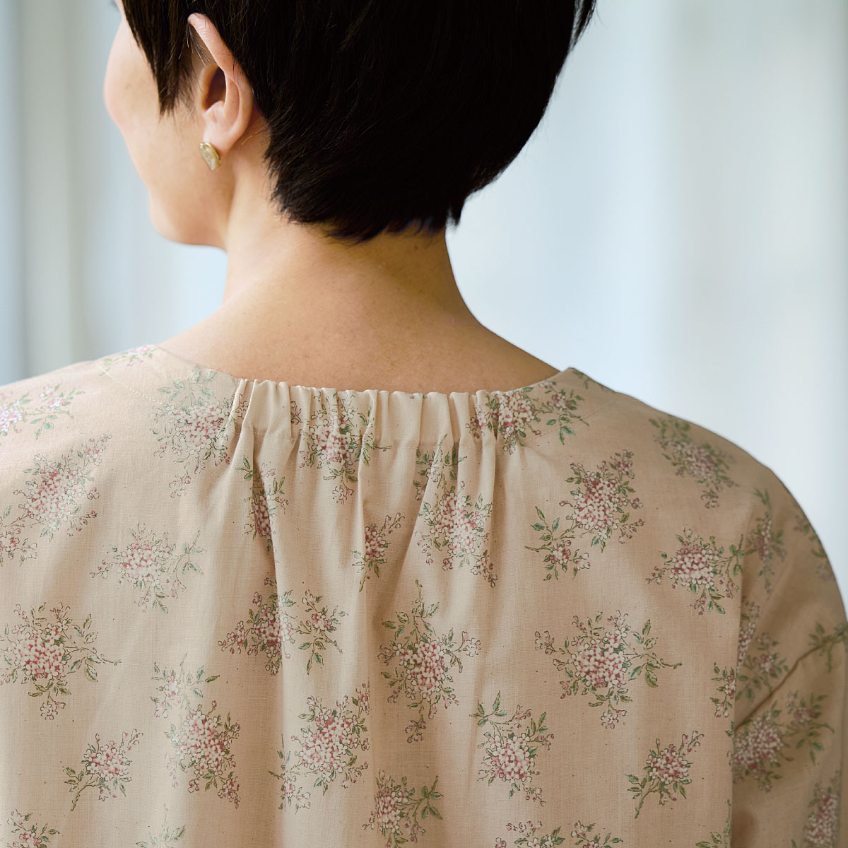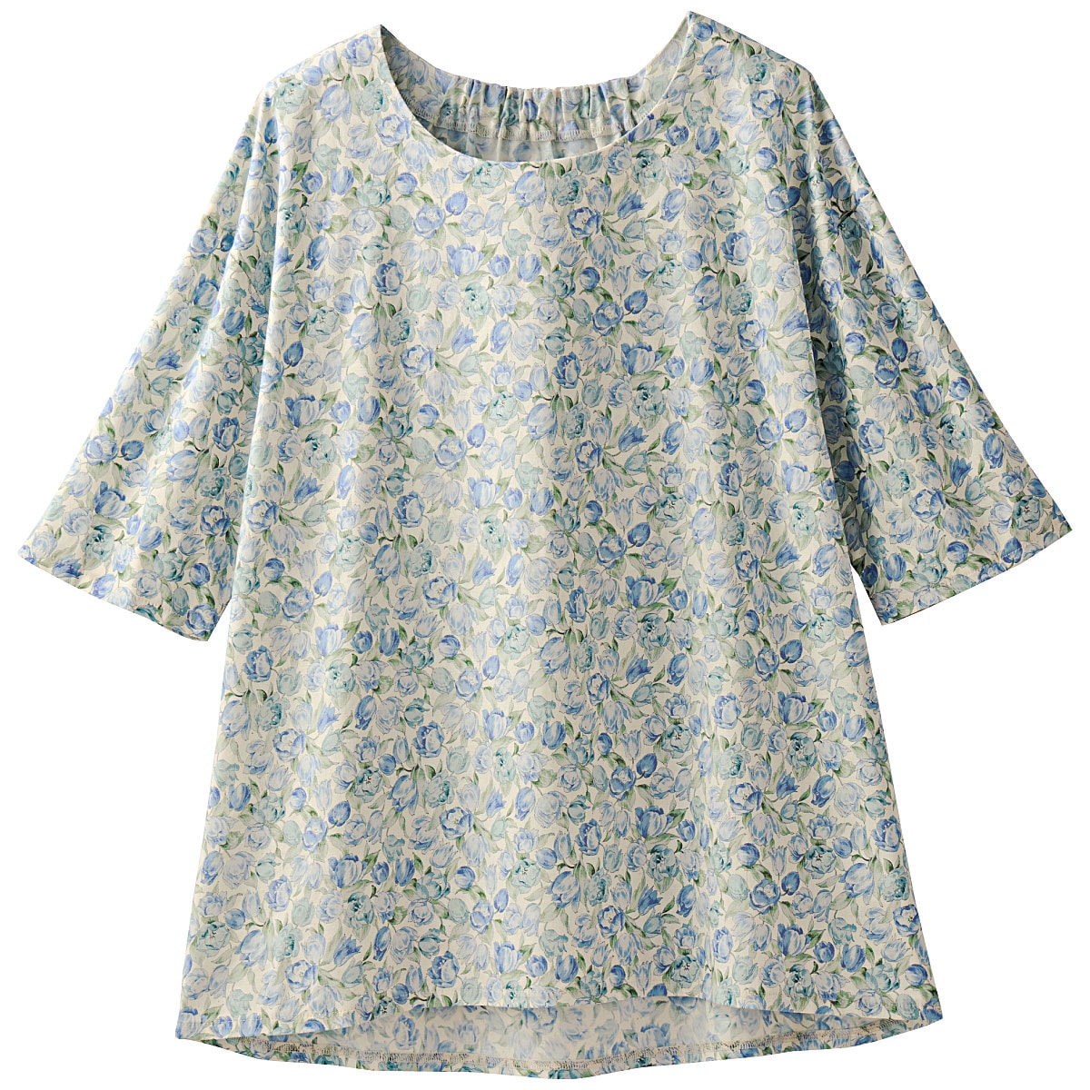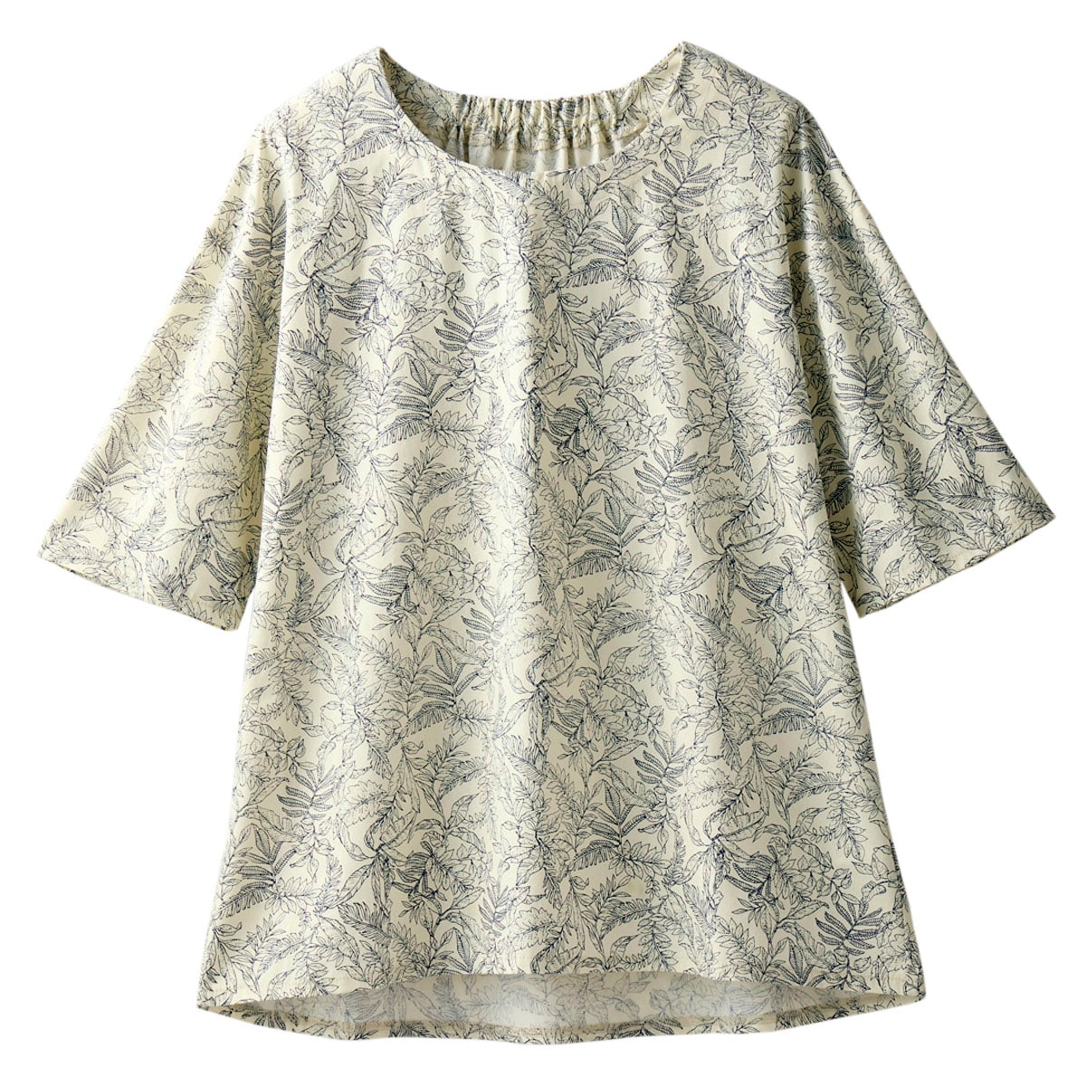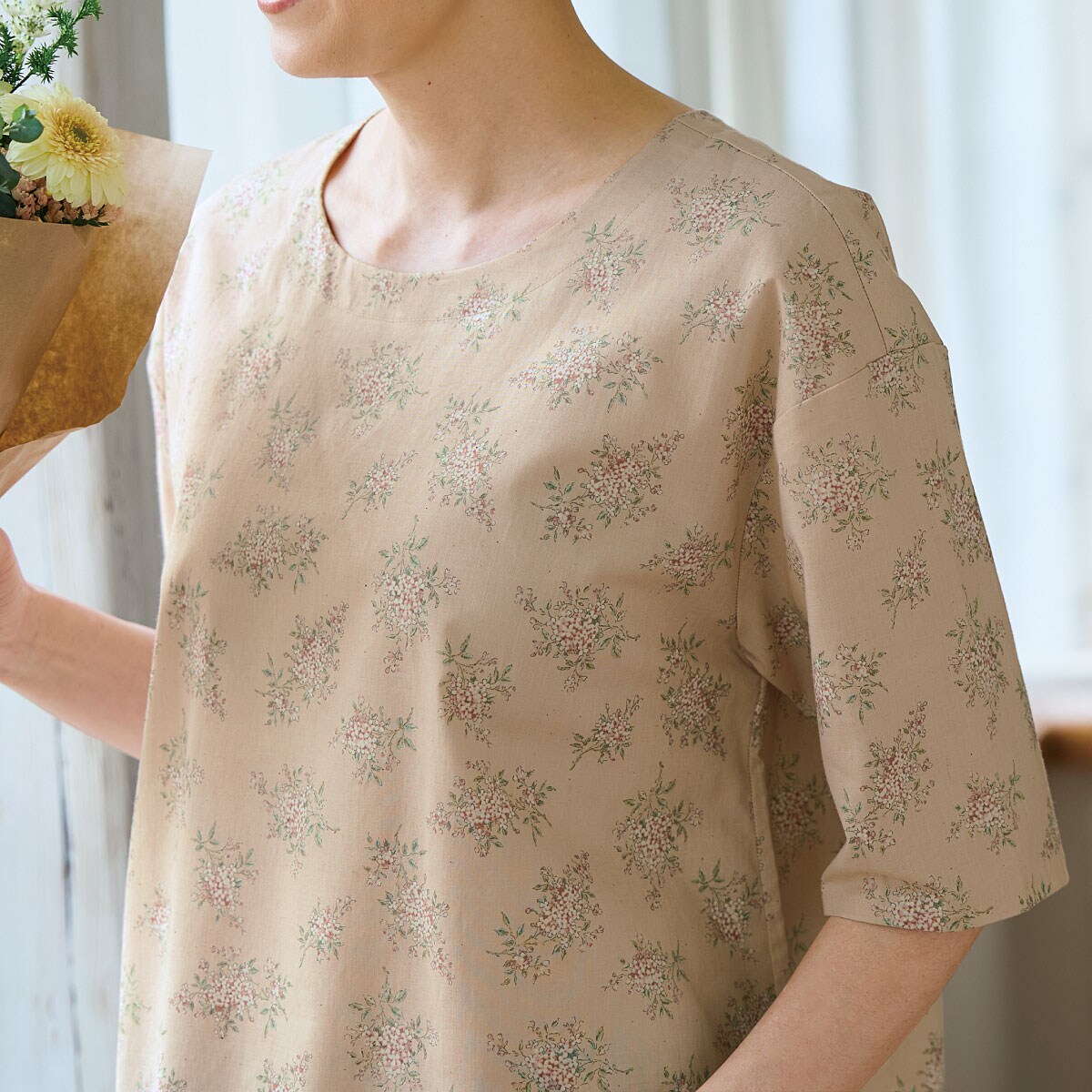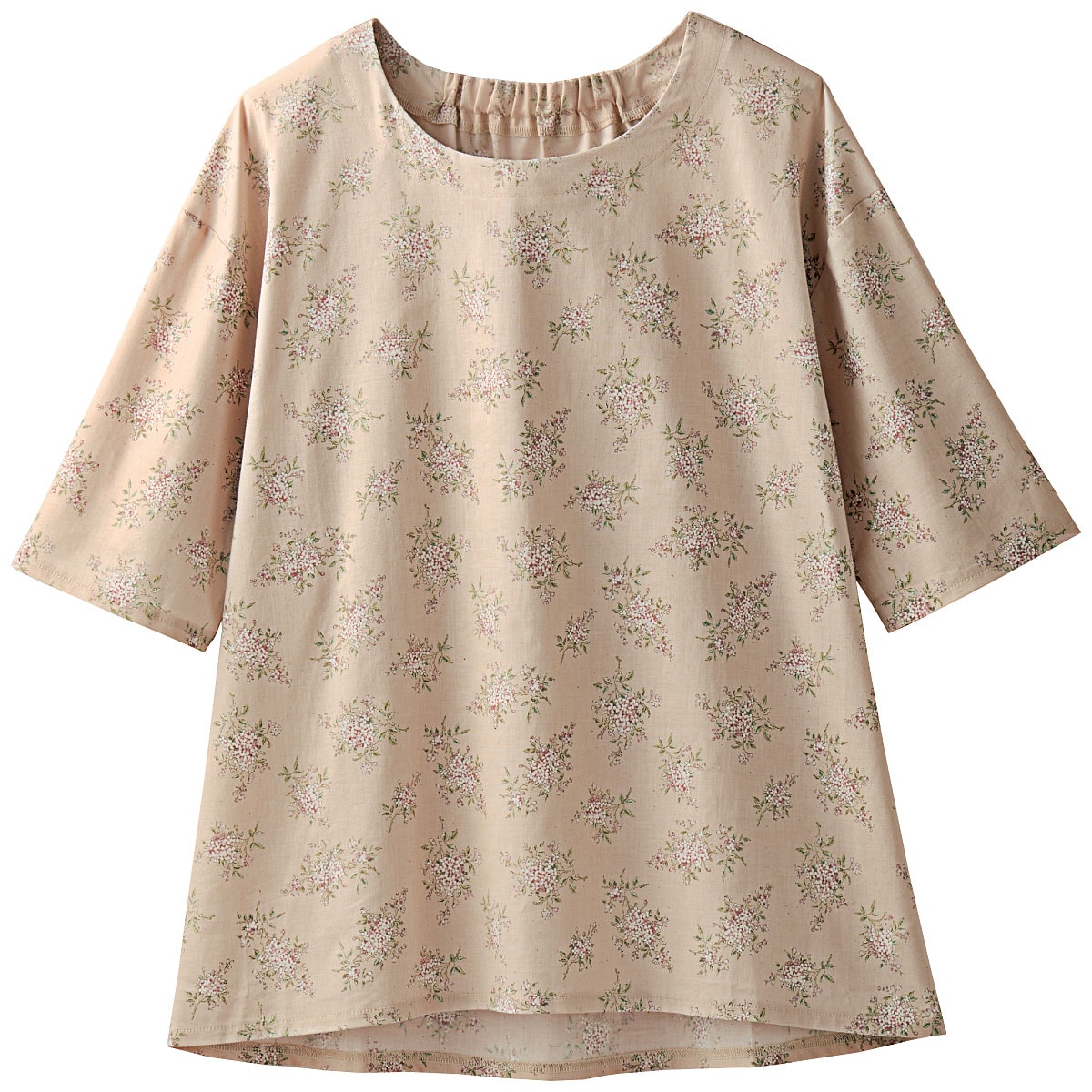 涼しいのがいい。でも、隠せるところは隠したい!柔らかい色合いの花柄で気分までやさしく!夏の肌にさらっと心地よい綿100%の花柄ブラウス。程よいゆとりのシルエットや二の腕をカバーするワイドな5分袖など、大人体型を考えたブラウス。ーデザインー後ろ衿のゴムはデザインポイントになりつつ、着脱のしやすさも考えた仕様。
