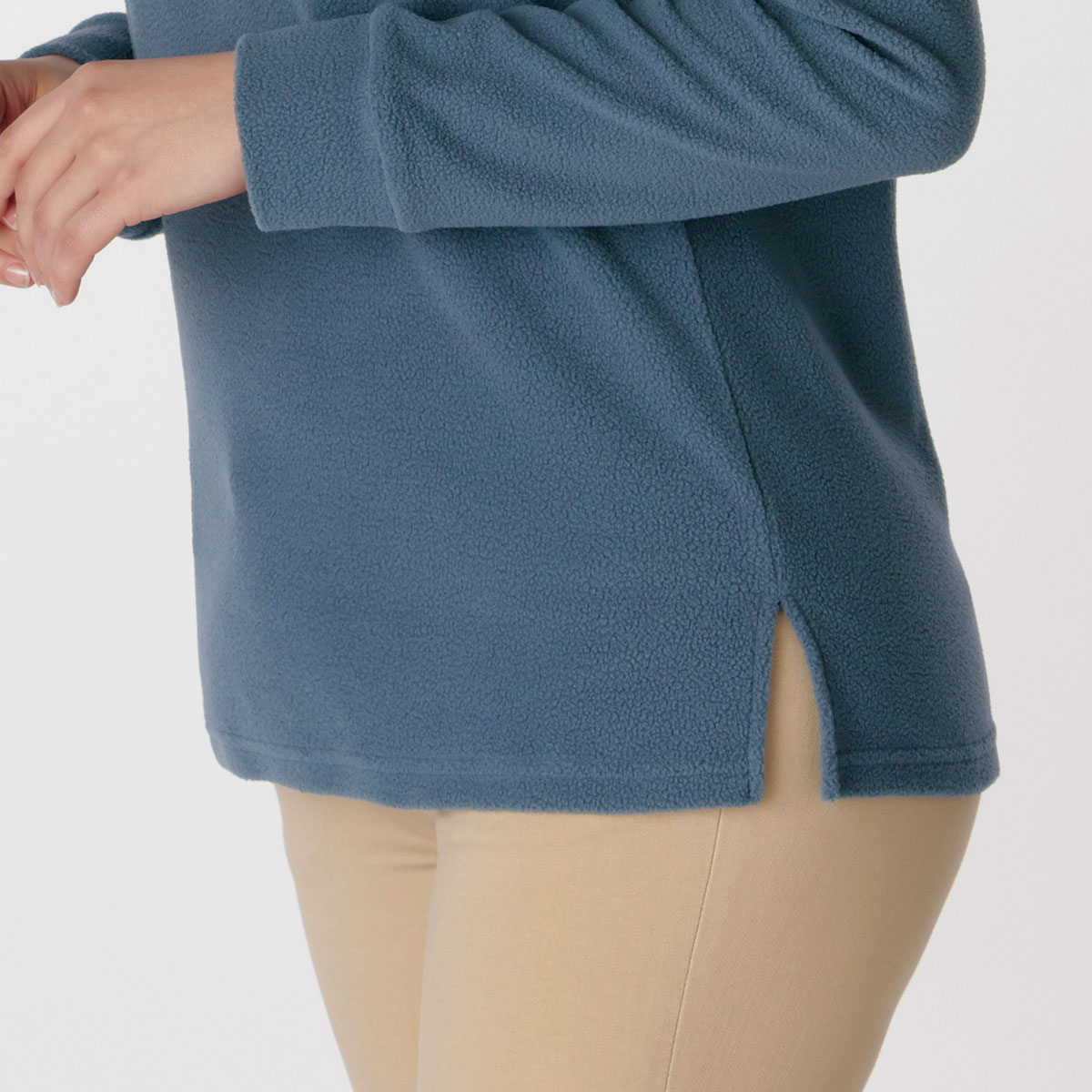 軽くて伸びるフリースで重ね着しても肌なじみが良くラクな着心地。アウトでもインスタイルでも使えて、大活躍!-こだわりPOINT-裾スリットとストレッチで脱ぎ着しやすい。-素材特性-裏側はフリースではないから、サッと着脱しやすい。