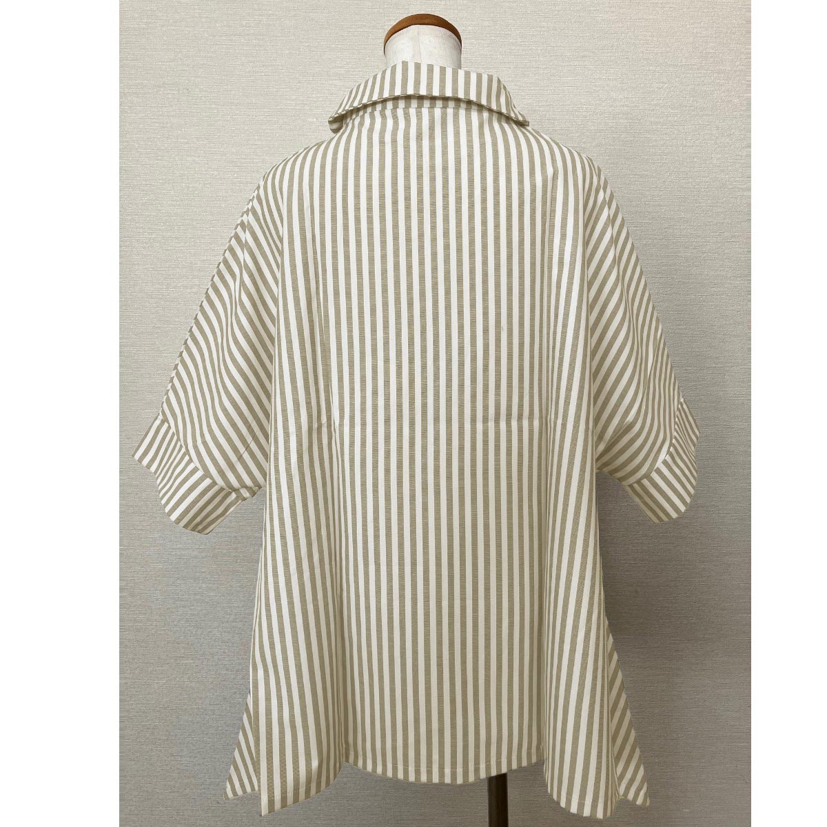 優しい印象のストライプの生地を使用したブラウスはドルマン袖と後ろが大きく広がった体型カバーデザインでゆったり着られる一枚です。イレギュラーに見える落ち感の裾もおしゃれ。ー素材特性ーハリ感がありきれい目に着られる綿混素材。