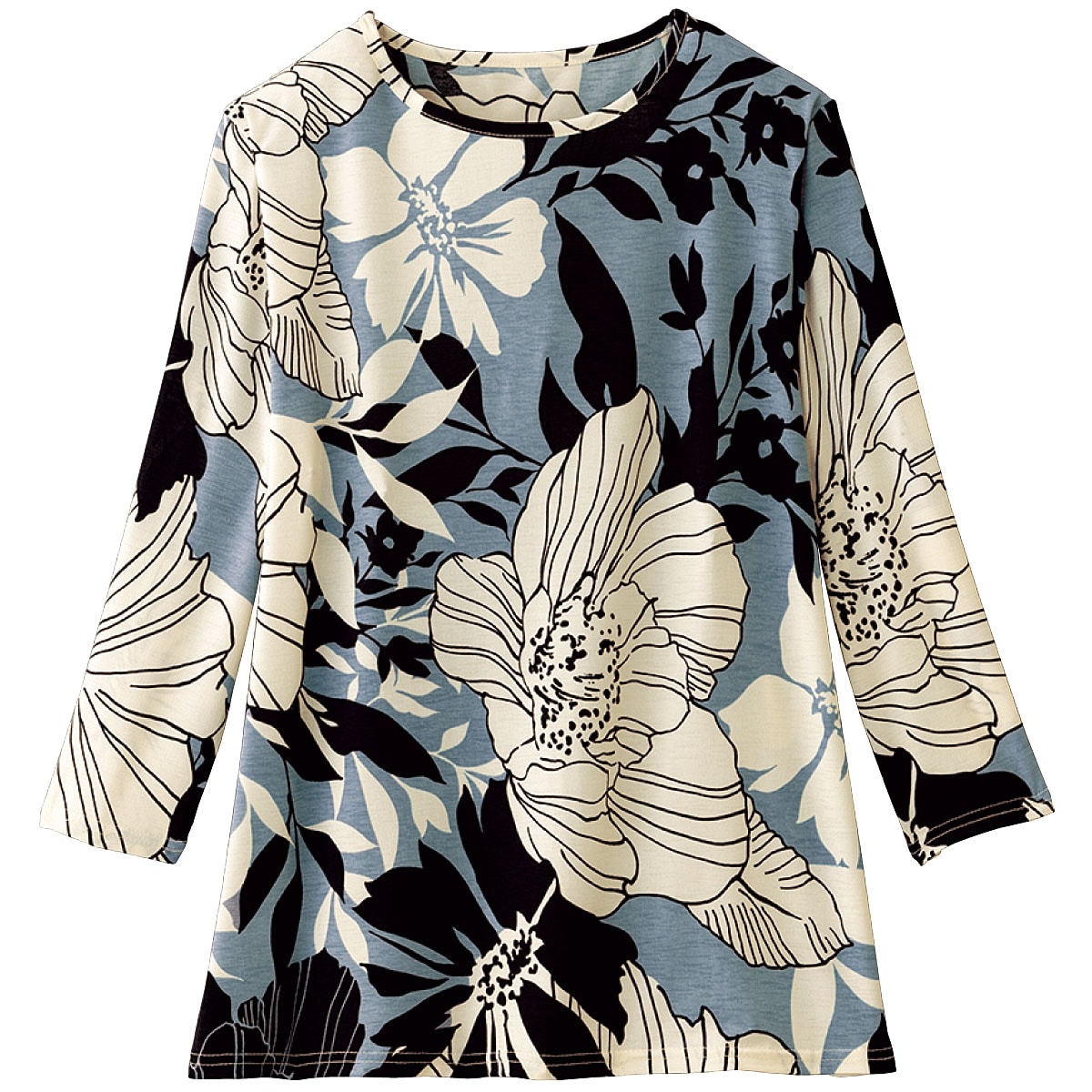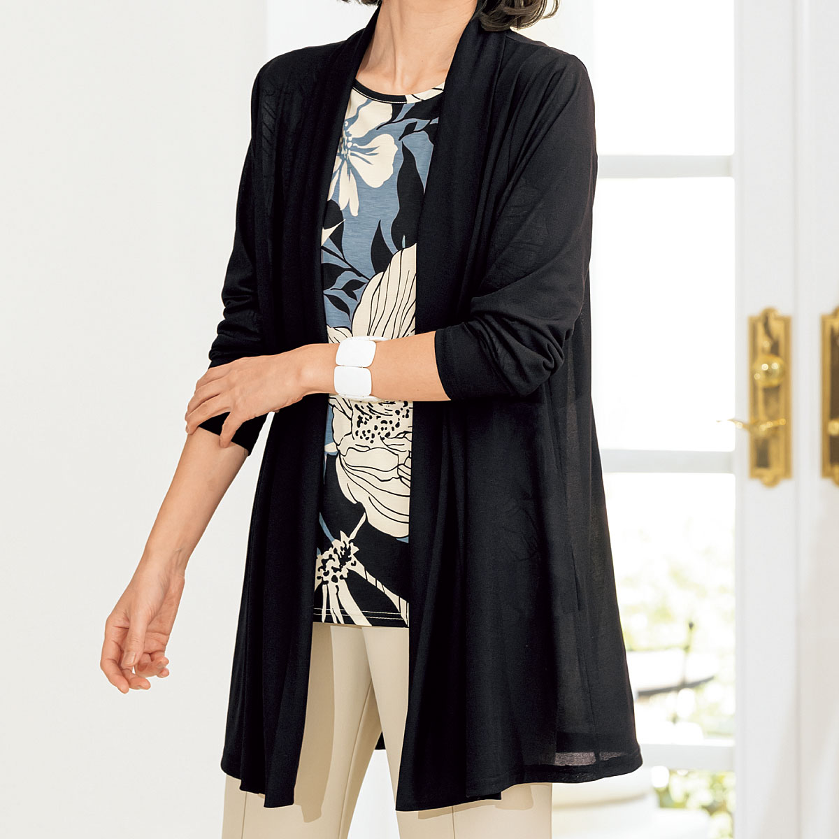 冷房や日よけ対策として活躍するトッパーカーディガンと、大胆なボタニカル柄が映えるプルオーバーのアンサンブル。ー素材特性ーストレッチ性があり、着心地のよいやや薄手の素材。[2点セット]トッパーカーディガンプルオーバー
